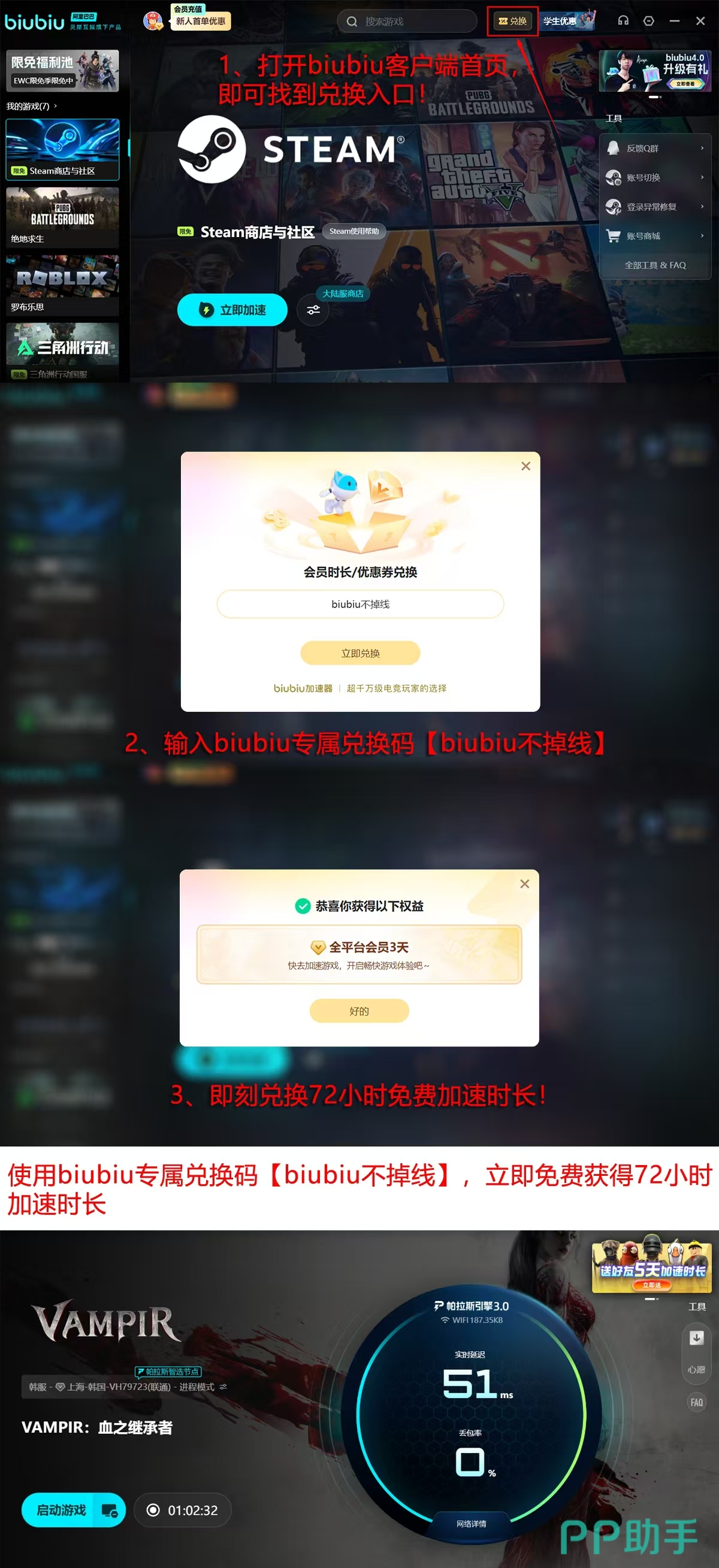 针对新用户,平台同步开放多重福利支持:完成首次登录即可激活24小时免费加速时长;输入专属激活码【biubiu不掉线】还可额外领取72小时权益,总计96小时无门槛使用机会。后续运营中,此类限时激励政策将持续迭代升级。