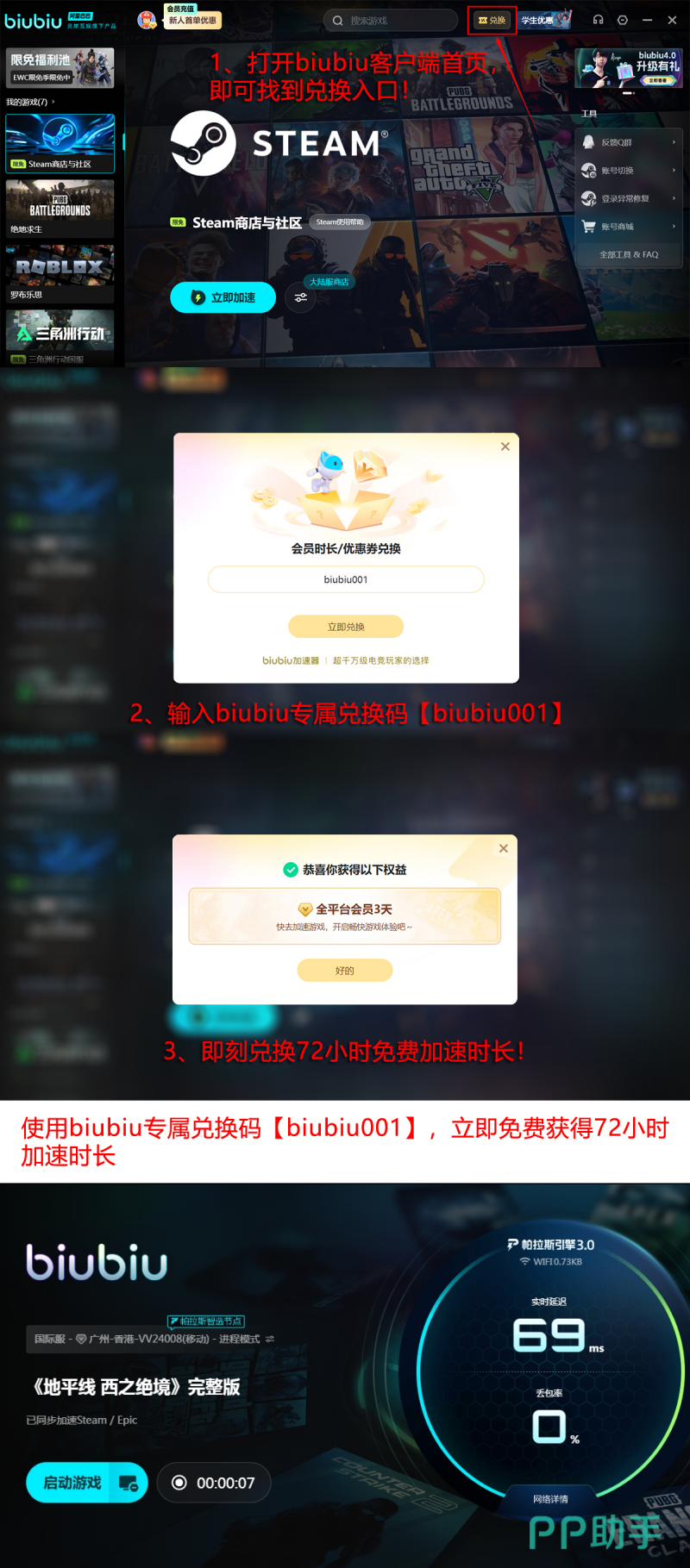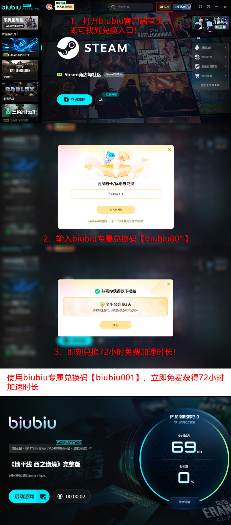 完成闪退治理后,还可同步领取专属福利权益。所有用户均可在biubiu加速器客户端内输入兑换码【biubiu001】,即时获取3天免费加速时长,无设备绑定、无账号等级限制。新注册用户首次登录后,系统将自动发放24小时新手体验时长。两项权益叠加使用,新用户最高可享96小时连续加速服务,全程零成本启用。