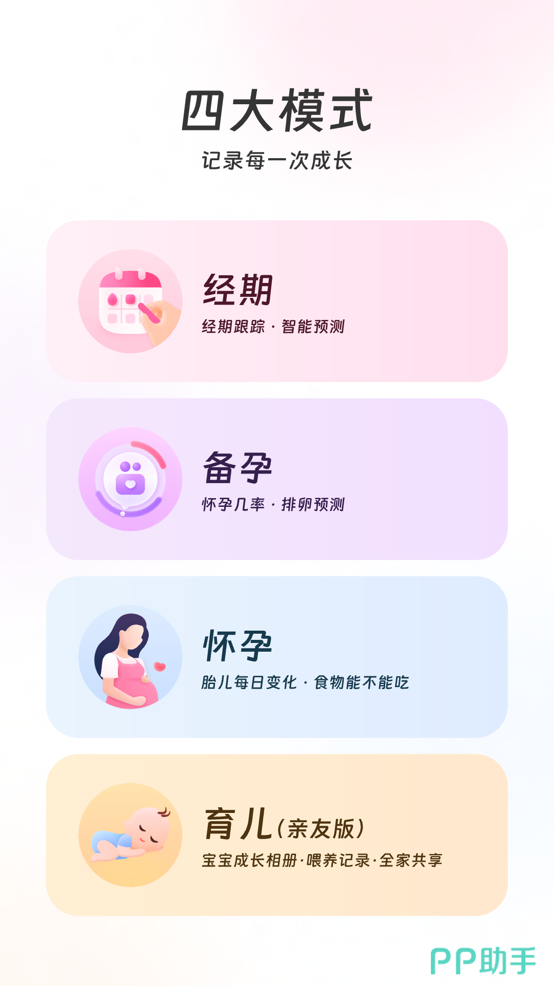 内置了四大模式,主要包括经期、备孕、怀孕和育儿,可以实时了解到胎儿的具体情况。宝宝出生后还可在上面记录TA成长的每一刻,支持上传图片和视频。其能够实现智能预测经期,有助于预防不良反应。