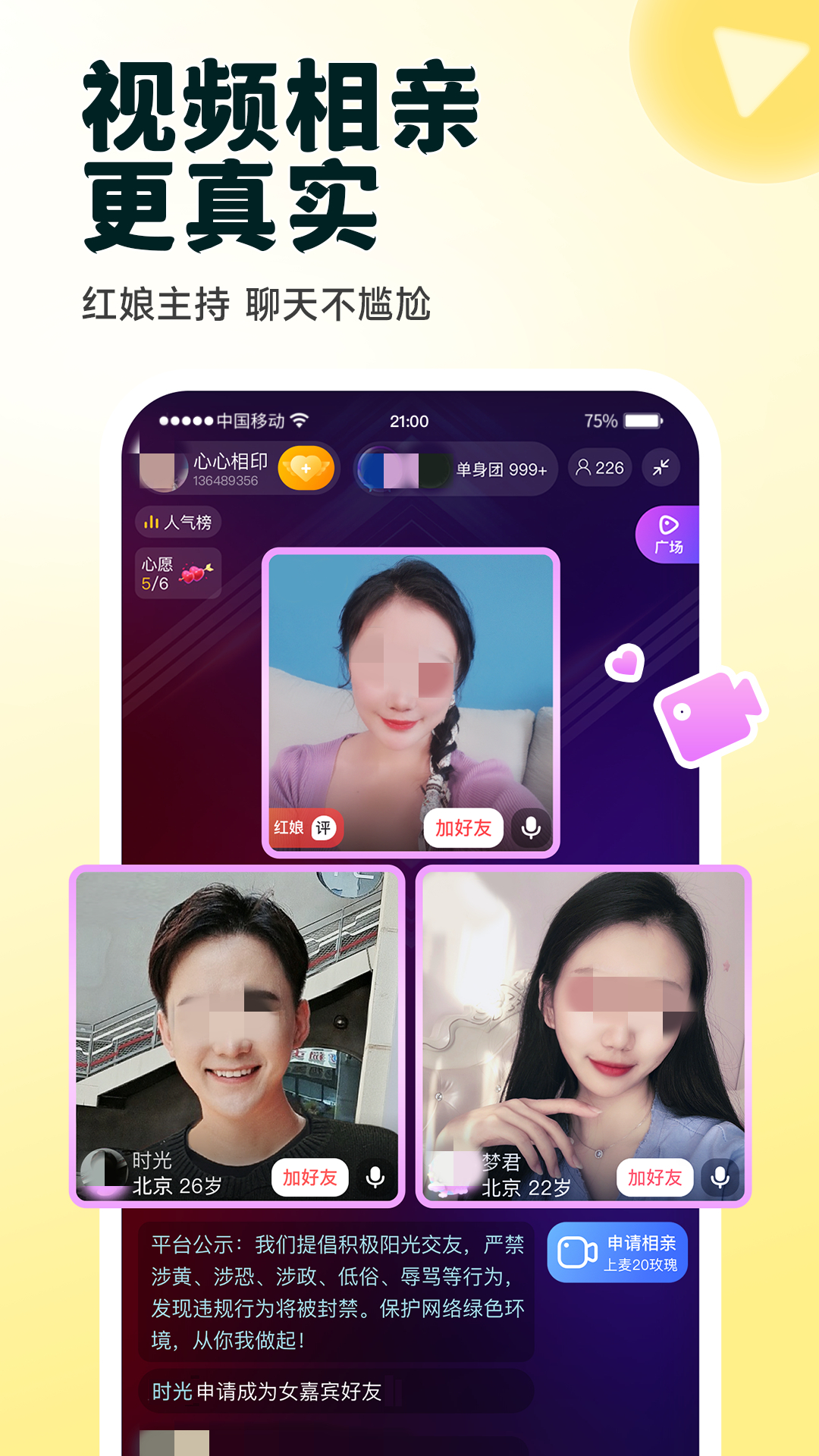 这是一款有趣又高效的视频约会APP,有大量红娘和月老帮助进行牵线,可以充分理解单身男女的感受,帮助进行把关。主打的模式就是红娘加上男女嘉宾的组合,这样三人视频也能避免尴尬,还能实现快速破冰,在这样的氛围下很快就能实现约会。