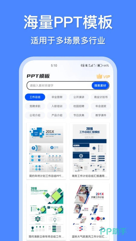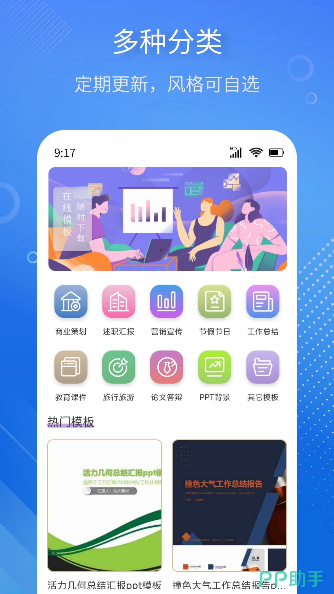 专注做PPT的模板,界面的选项分类非常的丰富,从商务到教学、从节日到求职等各种实用场景都有。而且还可以再细选表现风格,比如简约,童趣,中国风等。下载以后可以一键套用到旧文档上,实现无缝美化。