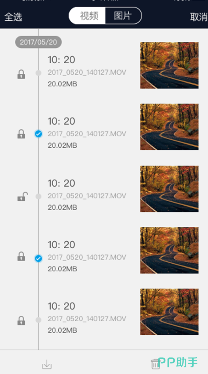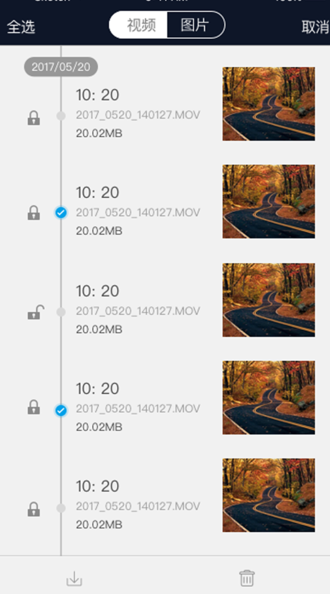 兼容多个品牌的车机记录仪,不局限于某一家,适用范围相对广。WiFi直连设备,不耗流量,视频预览和下载都在手机上完成,分辨率可以在1080FHD到480P之间调节,根据存储情况灵活选择。行驶中发生碰撞,视频自动锁定,停车状态下遇到碰撞也会自动开机录制并加密保存,两种场景都有覆盖。录好的视频支持全屏播放,缓存到本地后离线也能看,出门记录沿途风景也够用。