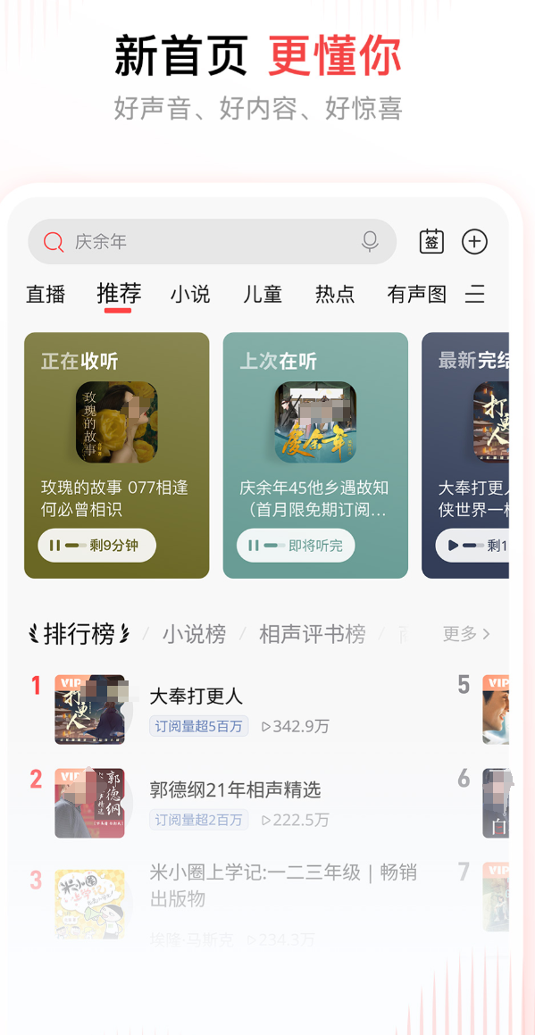 覆盖将近200个广播频率,有声书里能找到不少热门影视IP的原著,内容丰富程度在同类平台里算靠前的。场景电台的设计挺有意思,早起、通勤、睡前各有对应的内容包,不用自己费心选。大王卡用户免流收听,省了不少流量开销。弹幕功能上线后,听节目的时候能看到其他人的实时评论,多了点热闹感。多终端同步做得稳,手机切到车载不用重新找进度。