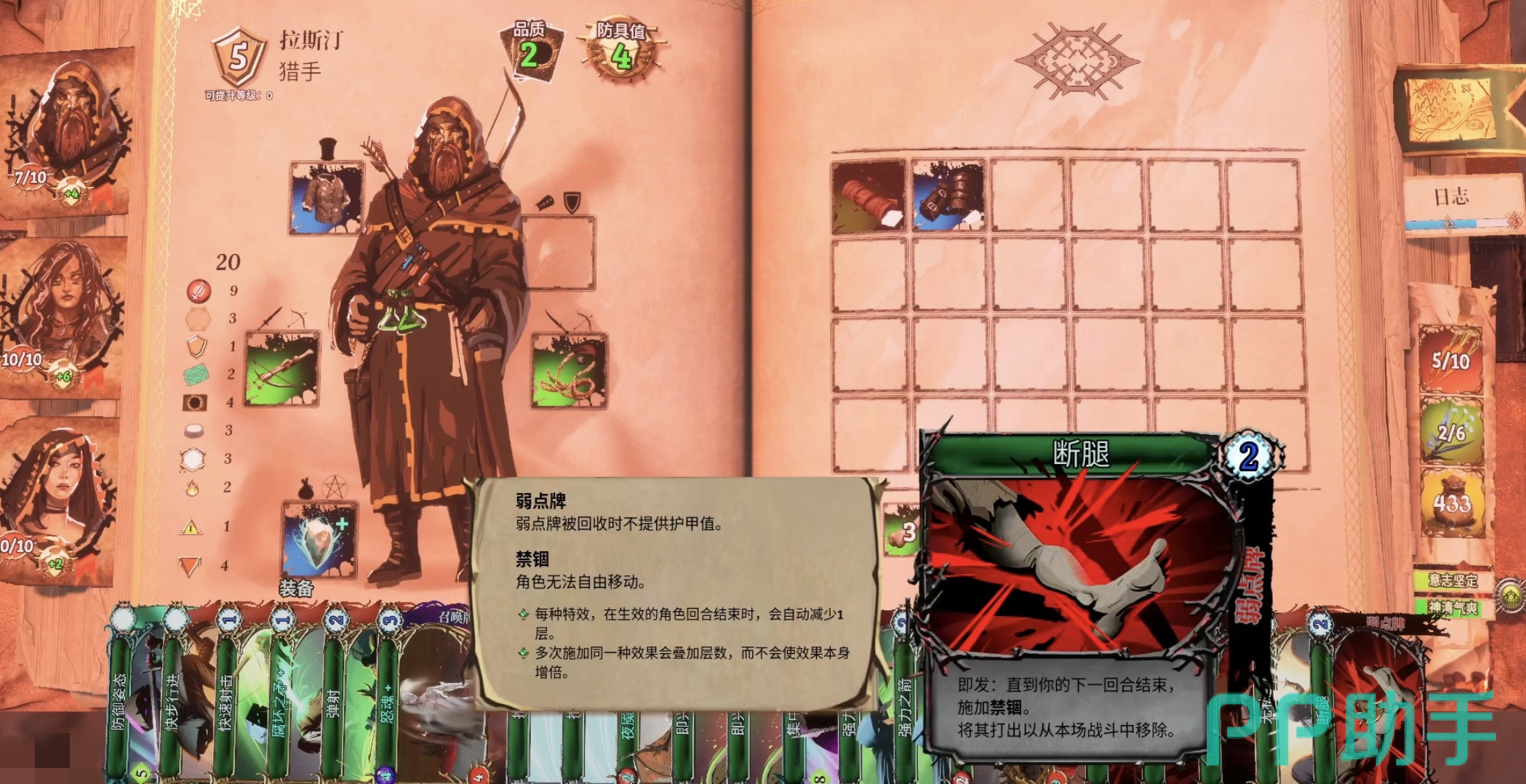 推荐构建爆发流派,核心卡组包括:集中精力(必备回费手段)、瞄准(叠加耐久,两张满级共提升8点攻击力,专精单体增伤)、神射手(强化远程伤害倍率)、走位(兼具位移与伤害加成,配合推进类效果可高效调整输出阵位)。主力输出技能应携带强力之箭、多重射击与歼灭;过牌环节推荐快速射击,兼顾低费用与稳定抽滤效率。毕业装备配置为:武器选用法拉隆之狐(大幅提升远程卡牌伤害)、护甲选择精灵追猎者锁链(每移动两格永久+1伤害,契合走A节奏)、饰品佩戴刻托之泪(无视目标护甲,实现真实伤害转化)。
