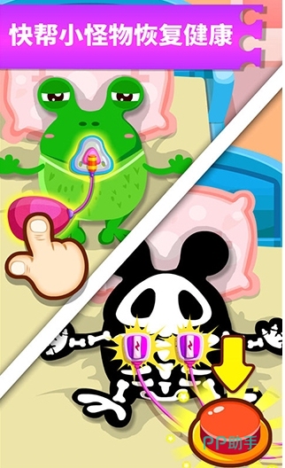 该作以幻想生物为就诊对象,打造轻松诙谐的医疗叙事空间。玩家担任主治医生,面对长角蜥蜴发烧、幽灵感冒、章鱼触手扭伤等趣味病症,需依症状选择听诊器、退烧贴、荧光绷带等定制化道具。2D手绘风格画面柔和饱满,音效温暖舒缓,全程无失败惩罚机制。内置DIY工坊支持自由组合医疗器械外观,激发创造力与表达欲,适合对怪兽题材有天然兴趣的幼儿群体。