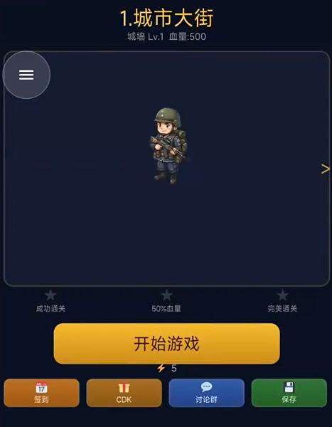 一开始进入游戏之后便会直接进入到战斗关卡之中,游戏的教学不多,在第一个关卡便和玩家说清楚了。咱们需要利用好城墙以及城墙上的武器来抵御僵尸大军。因为是第一关,所以本身的难度不高,主要还是以让玩家熟悉为主。