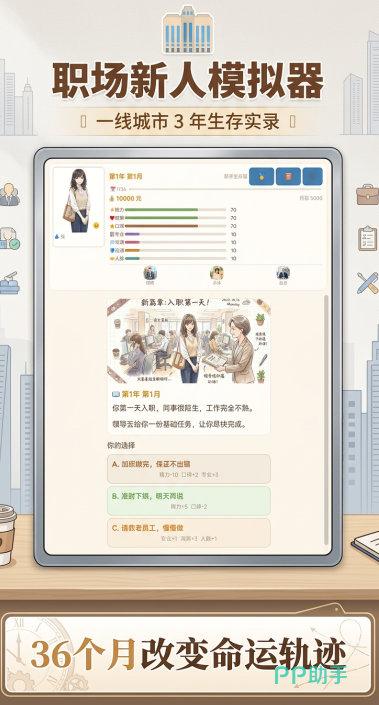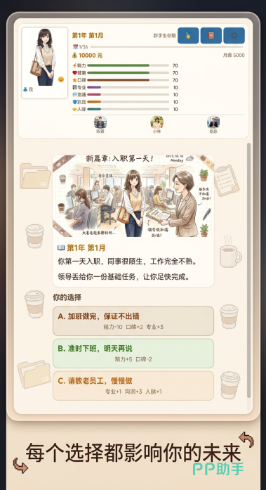 本作采用类PRG角色成长框架,设有体力、沟通、抗压、专业度等核心属性。区别于传统数值线性增长模式,各项能力会随玩家在会议、汇报、协作、加班等场景中的具体选择产生差异化浮动——某些选项可能提升短期效率但削弱长期稳定性,另一些则需消耗当前资源换取长远优势,强调权衡与规划能力。