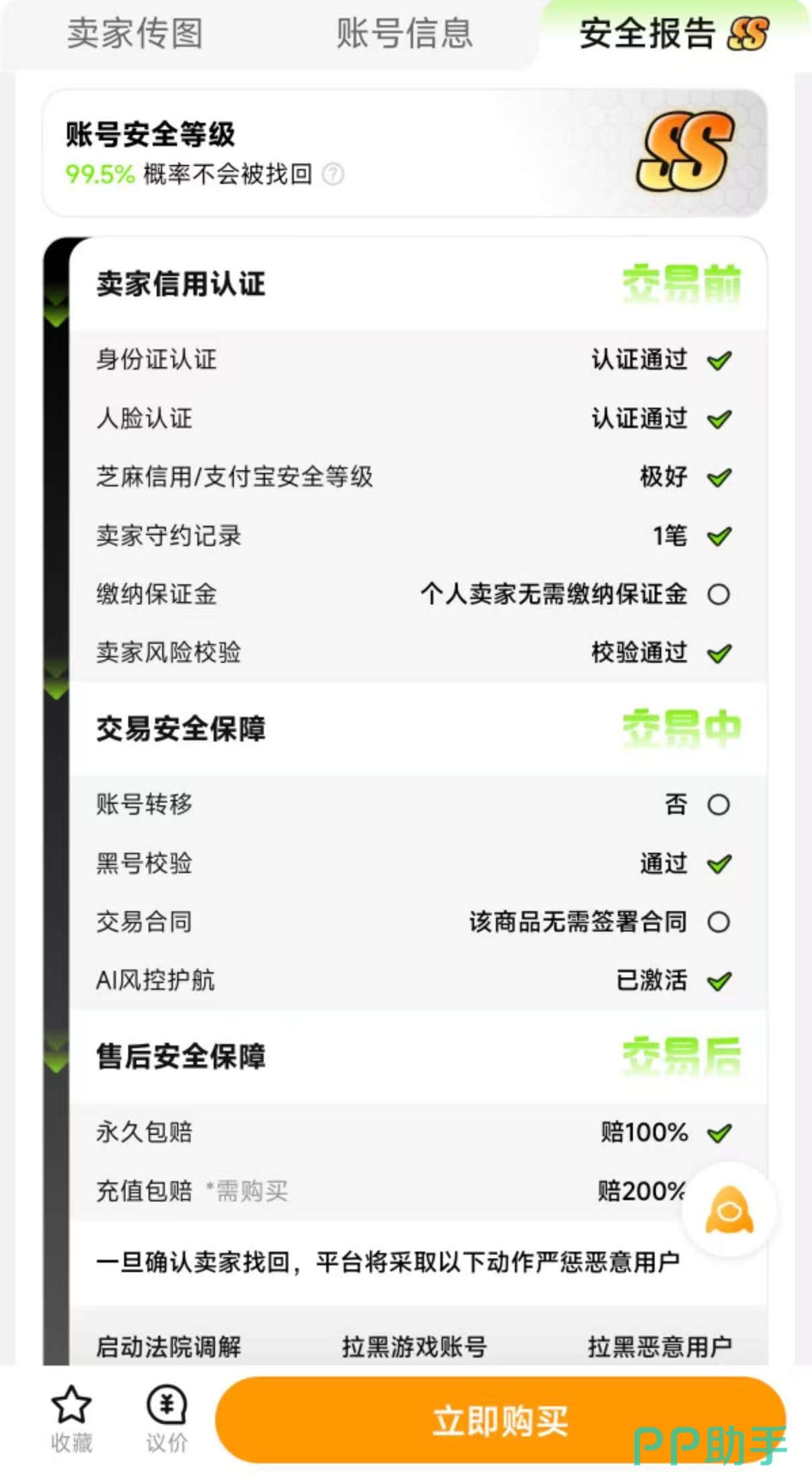 为强化风险防控,平台推出“账号安全报告”机制——该功能为交易猫自主研发,依据卖家实名认证状态、历史履约记录、资金担保方案、售后响应时效等多维指标,对每件商品生成动态安全评级。建议优先考虑SS级或SSS级认证账号,此类标的在历史交易中违约率低于0.3%,资产真实性验证通过率达99.6%以上。