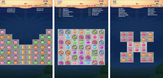 将消除与单词学习相结合,让传统的单词记忆快速转化成为消除闯关游戏,玩家在每次探索时都能够记忆更多的英语知识,通过滑动连接字母拼写单词,在得分的过程中巩固学习过的单词,掌握更多词汇知识有多样化消除模式,当前又延伸出经典的三消以及匹配相同词根分块,另外也设有完整的剧情关卡。