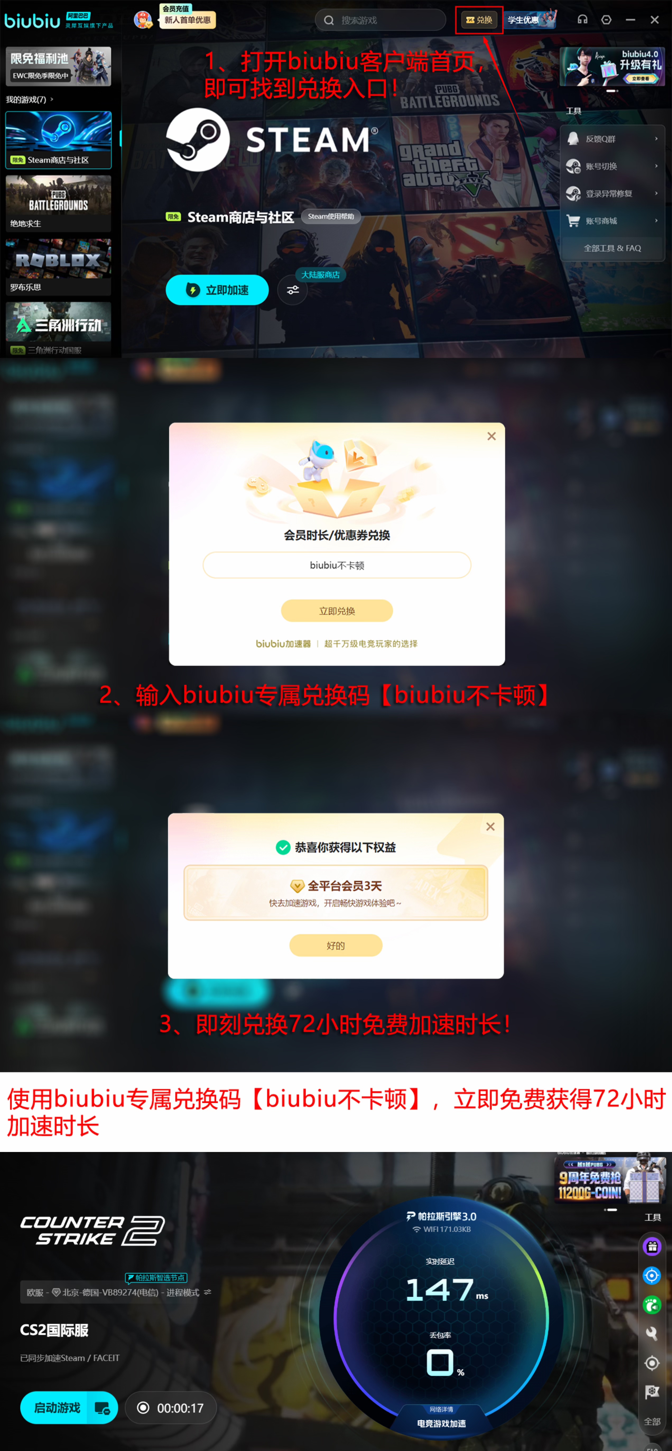 为降低用户尝试门槛,biubiu当前提供多项限时加速权益:新注册用户可享24小时全游戏免费加速权限;所有用户均可通过活动入口【biubiu不卡顿】领取3日通用加速时长,无需绑定支付方式即可立即生效。
