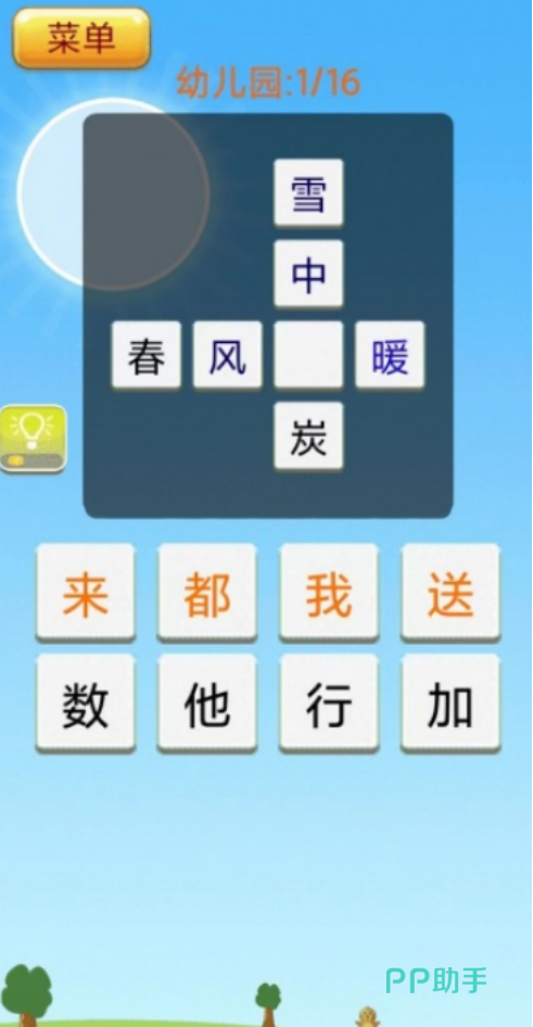将多种不同难度的等级全部结合,在每种模式当中都涵盖16道不同的题目,而大家可以通过逐渐闯关的方式来挑战自己,比如在起初幼儿园的题材当中,将会呈现出简单的几个成语。纵横交错在一起,其中又会缺失一个字眼,而大家却需要从单个的汉字当中寻找到正确的汉字填入进去即可。