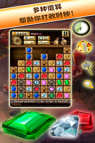 创新融合三消机制与考古叙事,宝石图块设计汲取古埃及图腾元素,背景画面融入金字塔、圣甲虫、亡灵书等文化符号。每关目标直指一件虚构文物,无步数约束,仅受动态倒计时调控;消除连击可触发“沙暴加速”“罗塞塔译码”等特殊事件,强化寻宝临场感。
