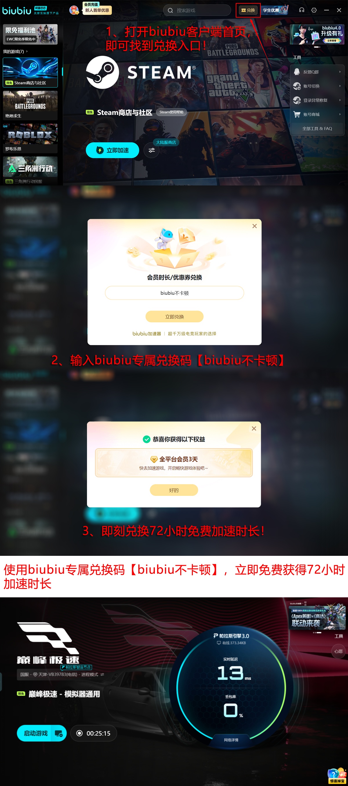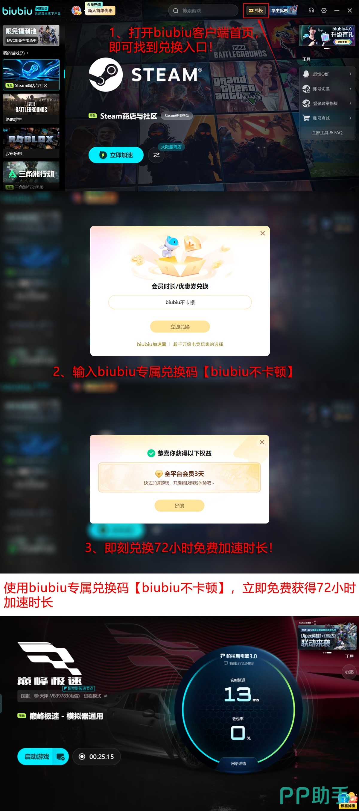 biubiu加速器持续聚焦玩家真实诉求,特邀《绝地求生》世界冠军小叮当担任产品体验官,依托职业级测试场景反向推动功能迭代。新用户注册即可获得24小时免费加速权益;所有用户输入兑换码【biubiu不卡顿】,均可额外领取72小时加速时长,新老用户叠加享96小时连续服务。