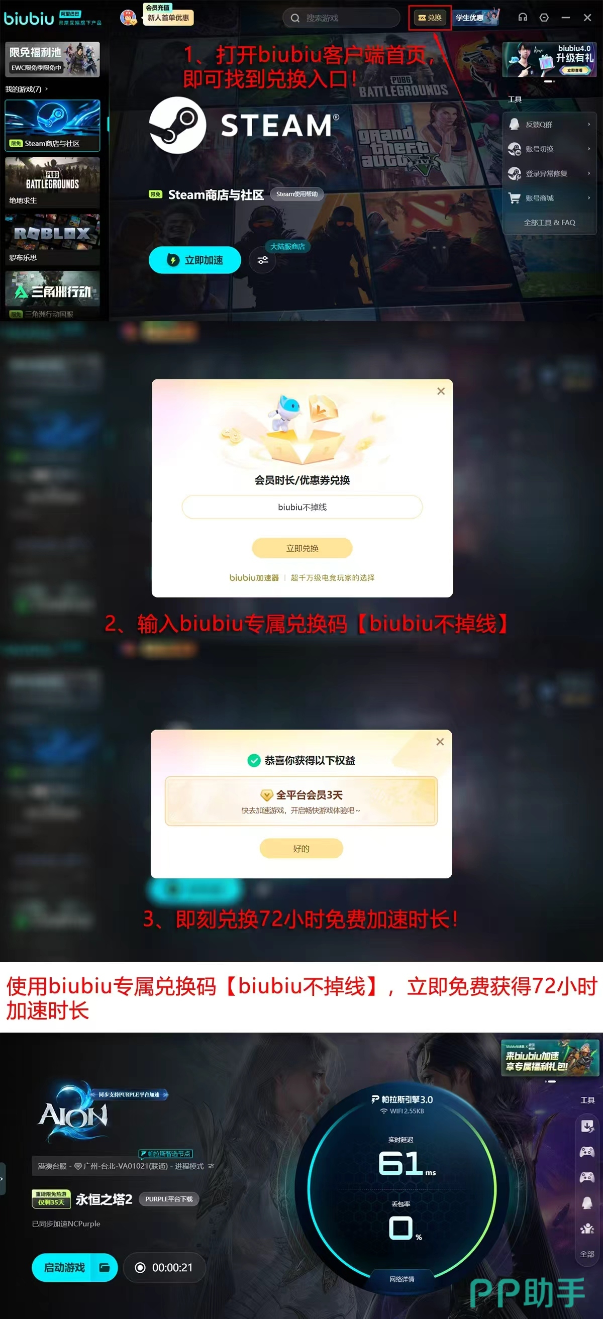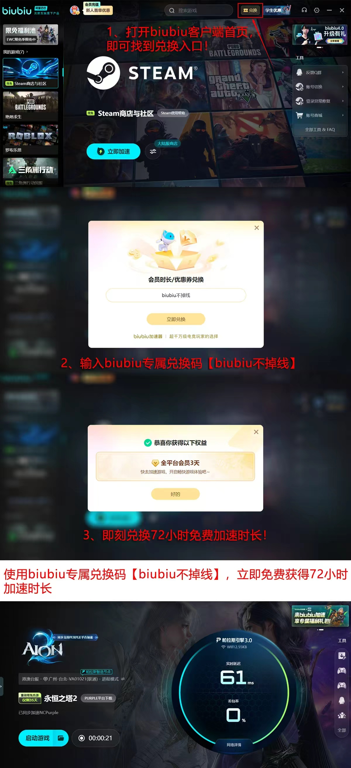 目前biubiu加速器正值新用户福利期:注册即赠24小时免费加速时长;完成指定动作领取【biubiu不掉线】礼包后,再享额外72小时服务时长;两项叠加总计可获得96小时无门槛加速体验。