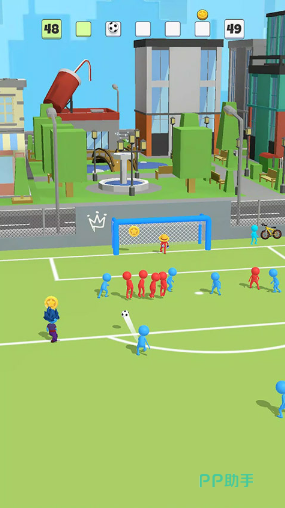 采用高度简化的视觉呈现方式,仅以色彩区分对阵双方,场地比例开阔,人物模型统一。操作界面清晰:左下区域为移动控制区,右下区域为交互按键区,支持一键传球或射门,指令响应即时,无需复杂连招训练,适合轻度用户快速进入状态。
