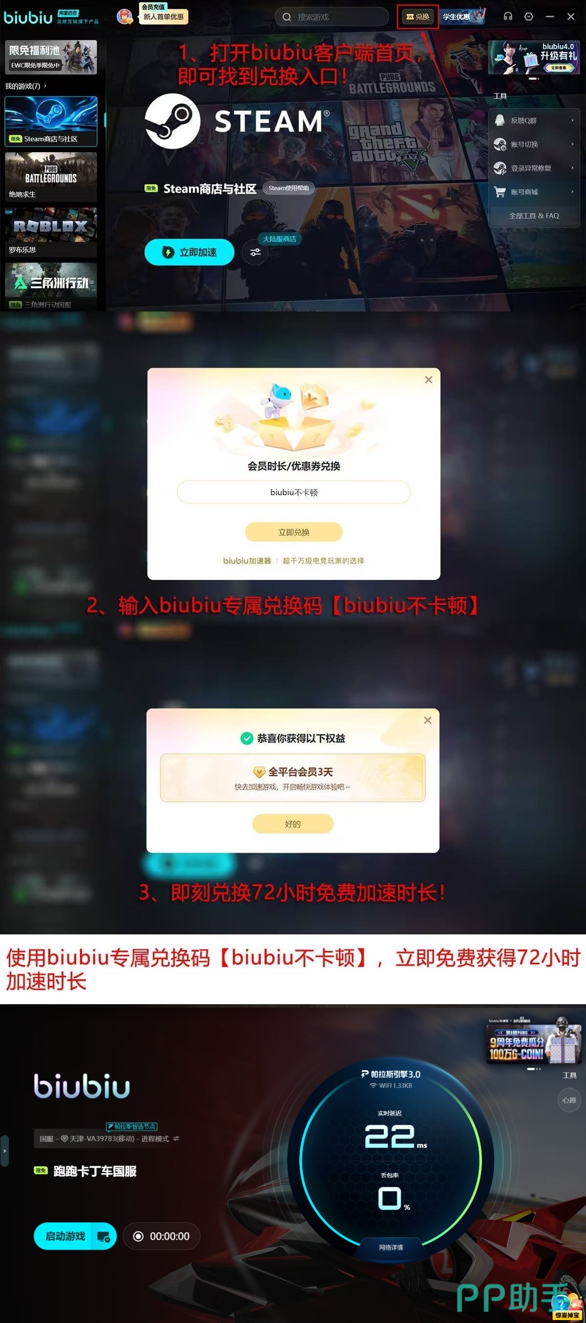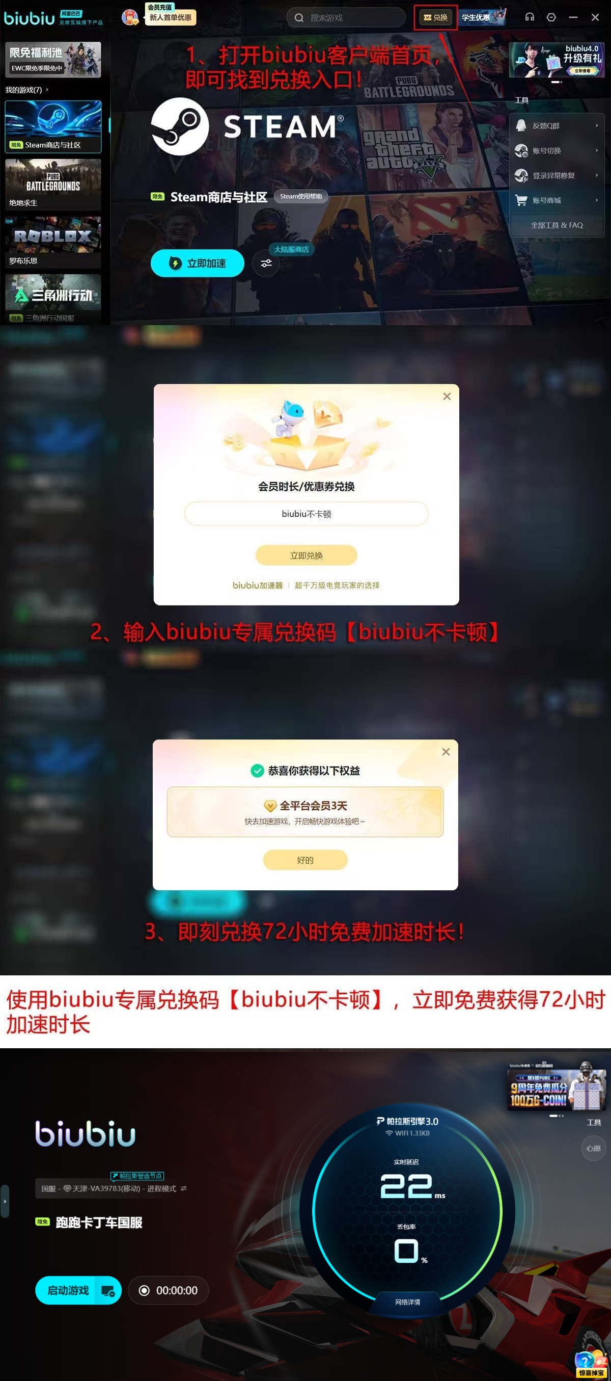 新用户专属权益同步开放:注册即享24小时全功能免费试用;输入激活码【biubiu不卡顿】,额外获得72小时高级加速服务;两项叠加,总计可连续使用96小时顶级网络优化支持。