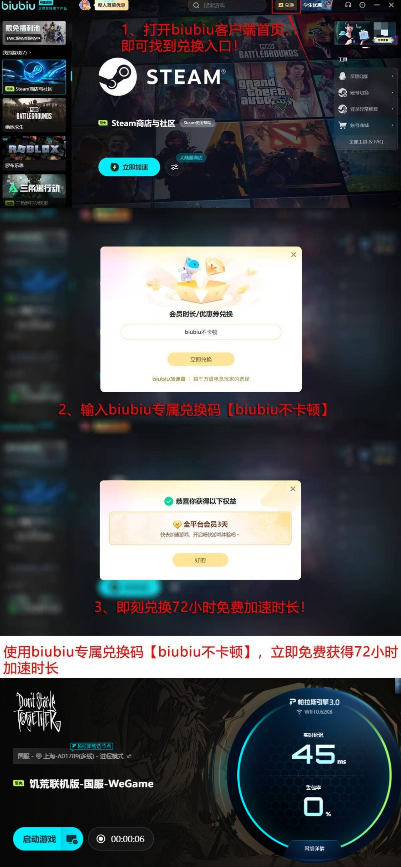 biubiu加速器注册后可享24小时免费加速,输入专属口令【biubiu不卡顿】可再获72小时,共计四天完整的功能体验,覆盖完整开荒周期——从首日搭建火坑、第二日采集铥矿、第三日建造暗影操纵器,到第四日挑战蚁狮王,全程保障服务器稳定在线。对固定队伍而言,该方案可将多人协作指令响应延迟压缩至35ms以内,大幅提升战斗配合效率与资源调度准确性。