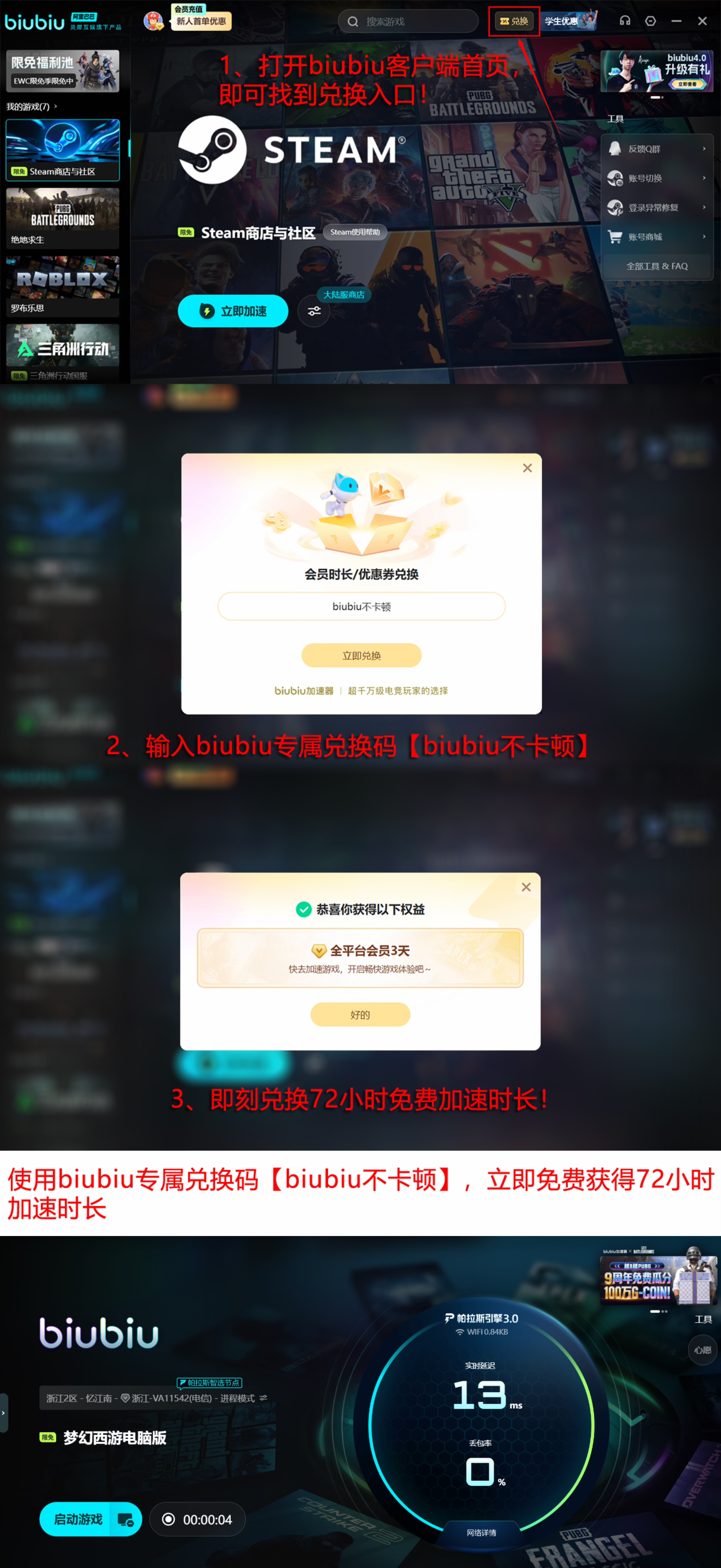 新用户完成首次注册并登录biubiu后,即可自动获得24小时全游戏加速权限;已注册用户亦可通过加速器内置兑换中心,输入口令【biubiu不卡顿】免费领取3天加速时长。此类分层福利机制覆盖不同活跃度群体,进一步提升工具实用性与用户粘性。