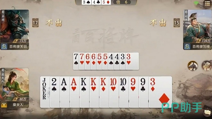 本作以经典三人斗地主规则为底层框架,深度融合三国历史设定,引入武将技能系统、名驹助战机制及残局博弈策略模块,形成兼具熟悉感与新鲜感的轻策略对战体验。