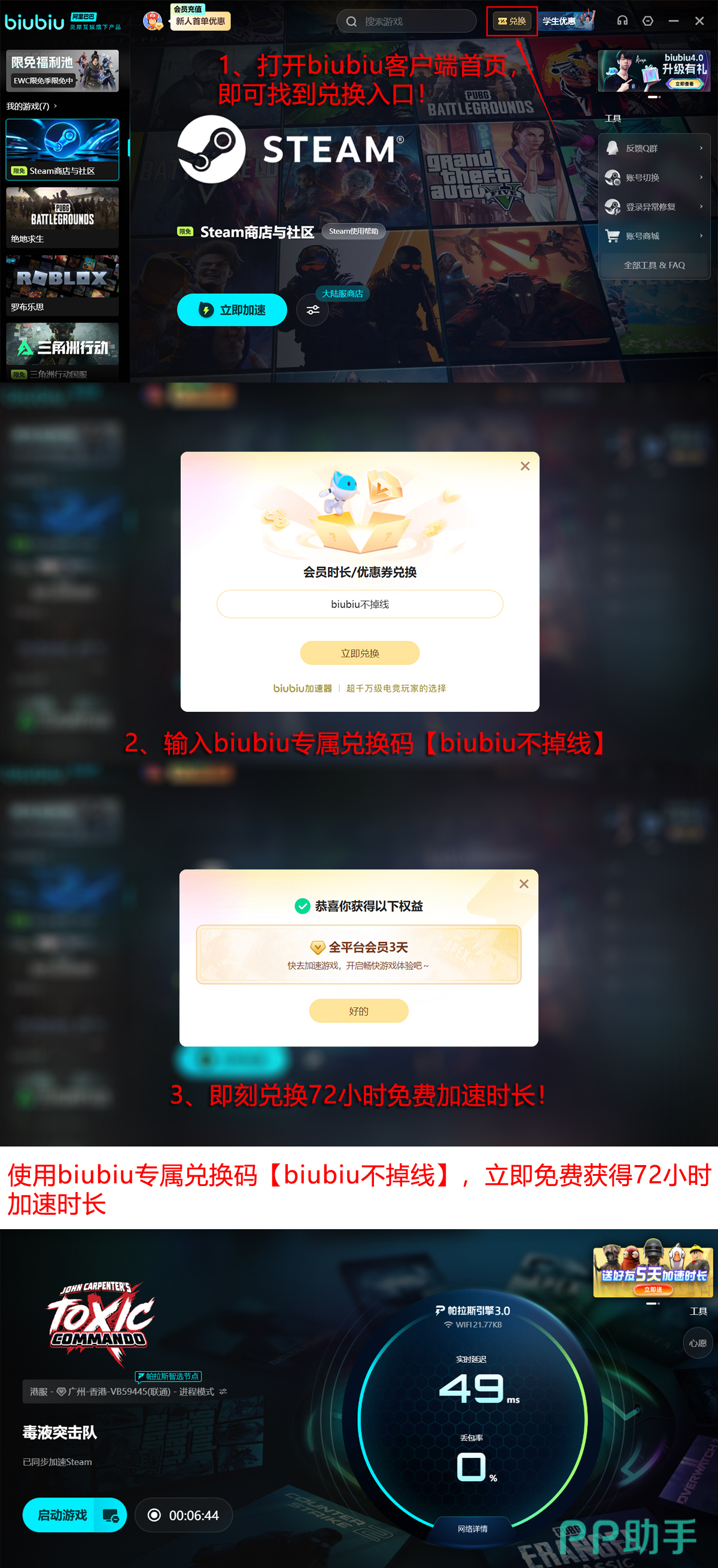 新用户注册即可立即获得24小时免费加速服务;参与平台兑换活动,输入口令【biubiu不掉线】还可额外领取72小时服务时长。两项权益叠加,首登用户可享总计96小时的零成本加速体验,充分覆盖游戏下载、更新及初期联机所需时间。