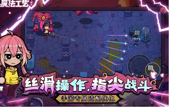 本作采用清新卡通美术风格,背景设定于古神侵蚀后的破碎大陆。玩家可操作魔女或男性法师角色,在俯视角战斗场景中实时释放范围法术、布置符文阵列、触发连锁奥爆。玩法融合Roguelike机制与弹幕式怪物潮设计,每局随机生成地图、咒文配方与敌方配置,强调法术搭配策略性与临场反应力。