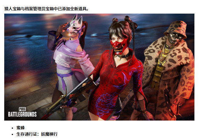 猎人宝箱与档案管理员宝箱新增道具:蜜蜂、生存通行证(妖魔横行)。