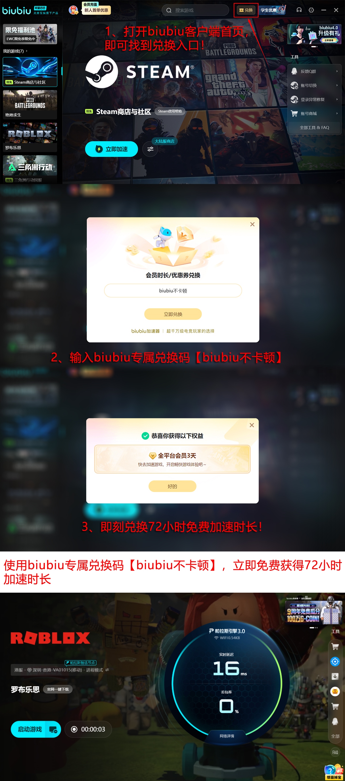 福利层面,biubiu加速器提供即时可用的新人权益:完成注册并登录后,自动发放24小时全功能加速时长;所有用户(含新老)在兑换页面输入口令【biubiu不卡顿】,即可额外领取3日高级加速服务权限。
