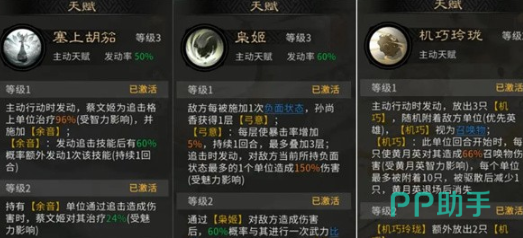 战斗逻辑围绕三层技能联动展开:首回合蔡文姬释放【塞上胡笳】,既恢复孙尚香生命值,又赋予“余音”效果,使其额外获得一次追击机会;孙尚香借此触发【枭姬】,优先锁定敌方负面状态层数最高的目标,造成高额伤害,并有60%概率发动连击;若存在余音buff,则可再追击一次,实现三段式爆发输出。
