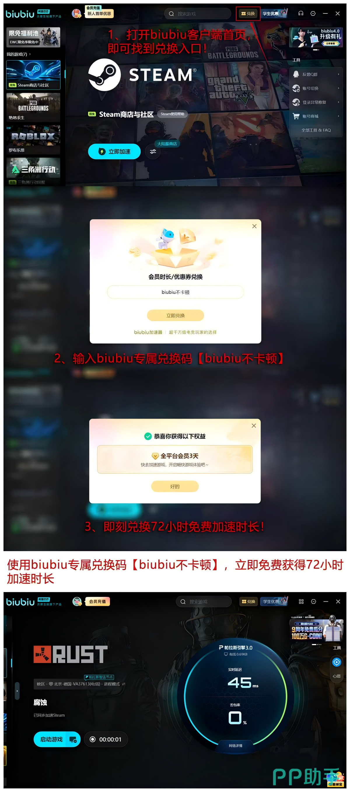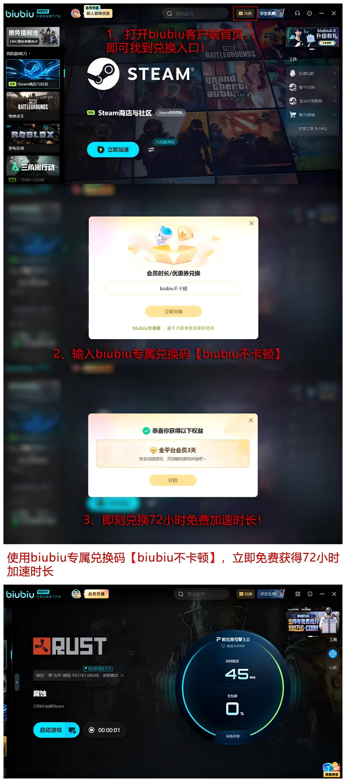 输入口令【biubiu不卡顿】即可领取72小时通用加速时长,该权益长期有效、不限使用次数;新用户额外享有24小时新手加速礼包,叠加后总计达96小时,足以覆盖多日高强度联机需求。尚未体验的玩家可借此机会免费测试加速效果,零成本验证实际提升幅度。