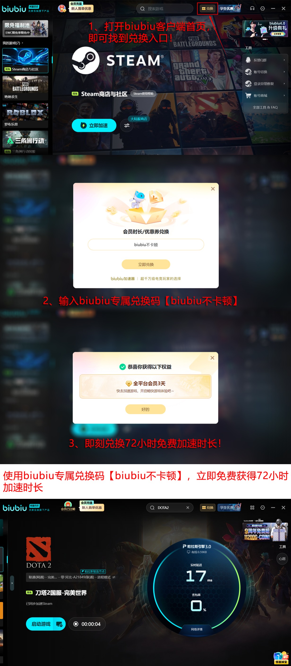 当前正值biubiu加速器功能升级窗口期,用户在客户端兑换界面输入【biubiu不卡顿】即可领取72小时全游戏加速权益,不限新老账户。首次注册用户还可额外获得24小时专属加速时长。