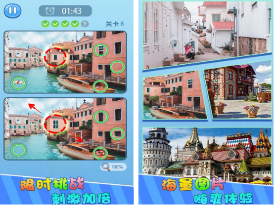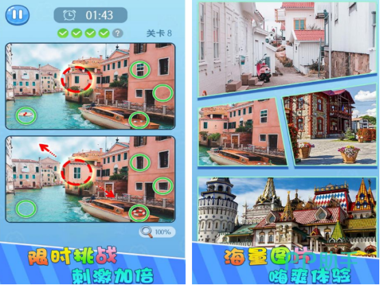 经典视觉辨识类游戏,每关限时两分钟,需在高度相似的两幅高清图中精准定位全部5处差异。图库涵盖自然风光、城市建筑、动植物特写等多种主题,细节层次丰富,难度梯度平缓。内置万能提示道具降低挫败感,适合各年龄段亲子共同参与,在有限时间内训练快速扫视与细节捕捉能力。