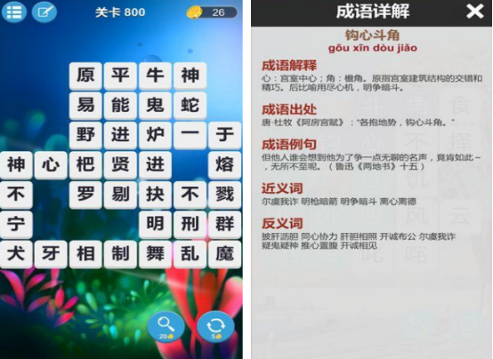 融合传统文化与轻度益智玩法的语言学习工具,收录常用四字成语超千条。游戏采用方块填空形式,玩家需根据提示选择正确汉字组合成完整成语,成功提交后即时显示释义、典故出处及关联词汇(含近义词、反义词)。操作直观,容错率高,是提升语文素养与亲子共学的理想载体。
