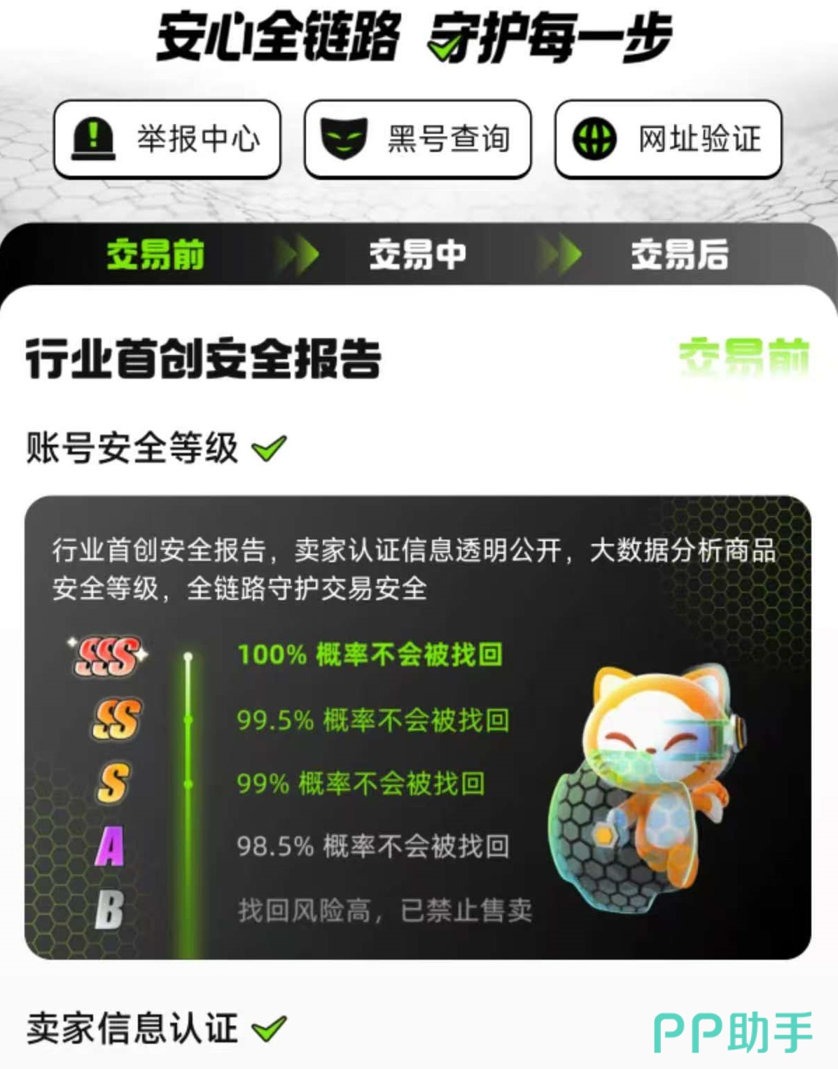 在基础保障之外,交易猫自主研发“安全链路”技术路径,将风险防控前置化、标准化。所有上架账号均需通过平台出具的《账号安全等级评估报告》,依据实名认证强度、历史登录行为、绑定设备稳定性、芝麻信用分值等多维数据,动态生成SSS、SS、S三级安全评级。建议用户优先选择SSS级账号,显著降低交易不确定性。同时,卖家身份核验采用“三重认证”机制:身份证信息联网比对、活体人脸识别、芝麻信用授权绑定,并由平台联合第三方权威征信机构完成交叉验证,确保每一条交易记录背后都是真实可追溯的自然人主体。