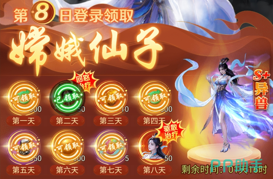 连续登录可领取阶梯式奖励,次日获得金乌,第八日获取嫦娥,二者均为泛用性强、适配度高的优质异兽角色。