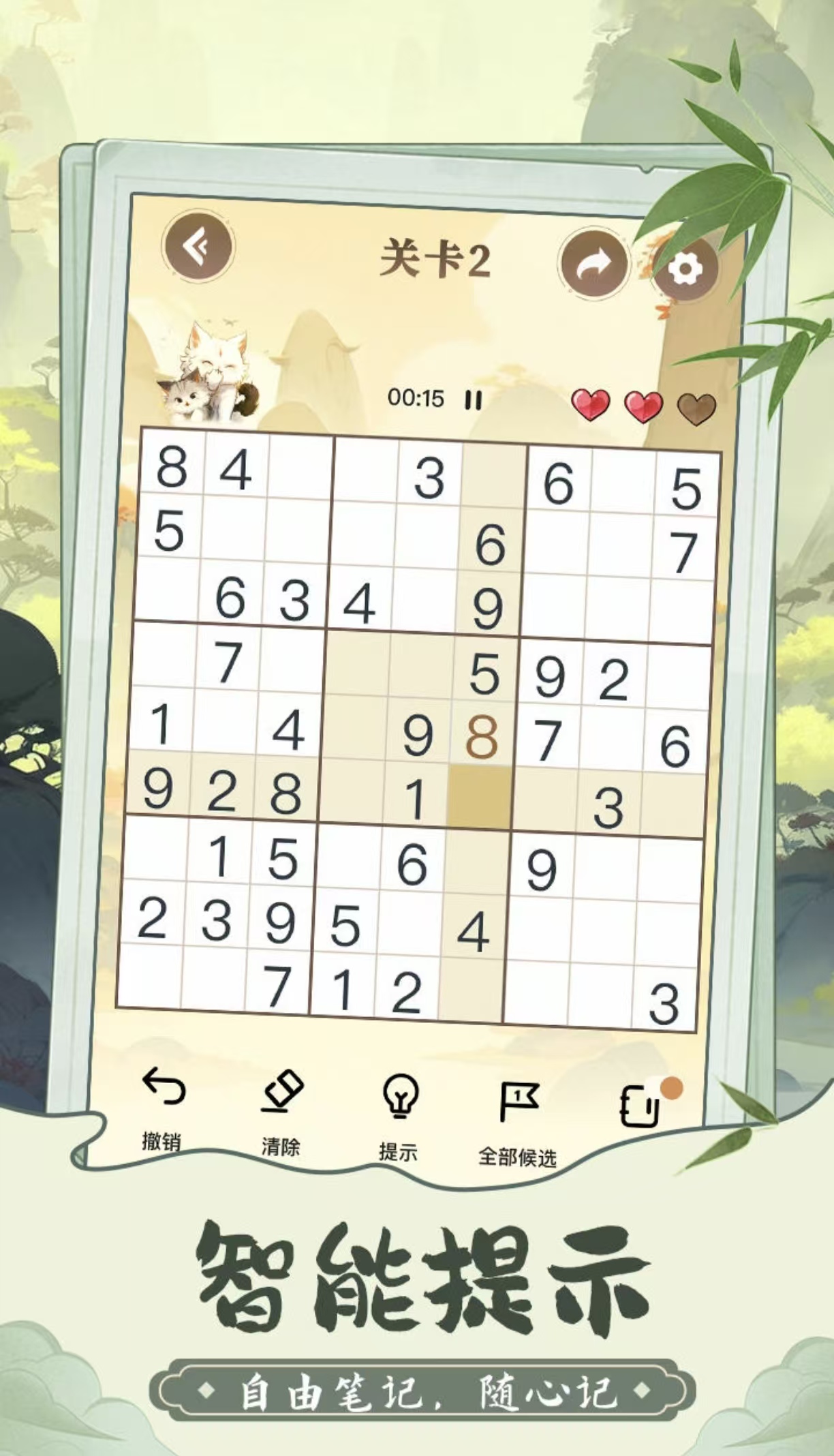 采用国风水墨美术风格,支持四宫格、六宫格、九宫格三种标准难度切换。系统自动记录单局用时,便于玩家追踪解题效率;题库由专业数独设计师编排,确保唯一解与合理难度曲线。完成关卡可收集《山海经》系列神兽拼图,含白泽、夔牛、狌狌等经典形象,寓教于乐。