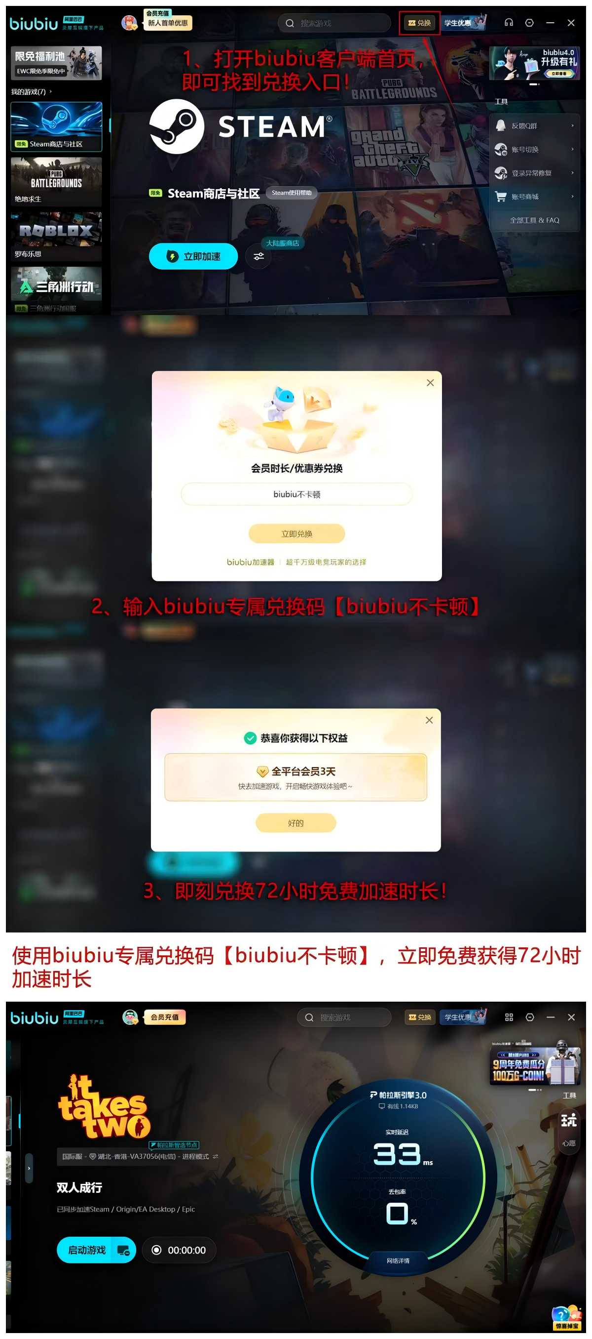 输入口令【biubiu不卡顿】,即可领取72小时专属加速时长;该权益可与新用户注册赠送的24小时叠加使用,总计获得96小时连续加速服务,满足多日稳定联机需求。
