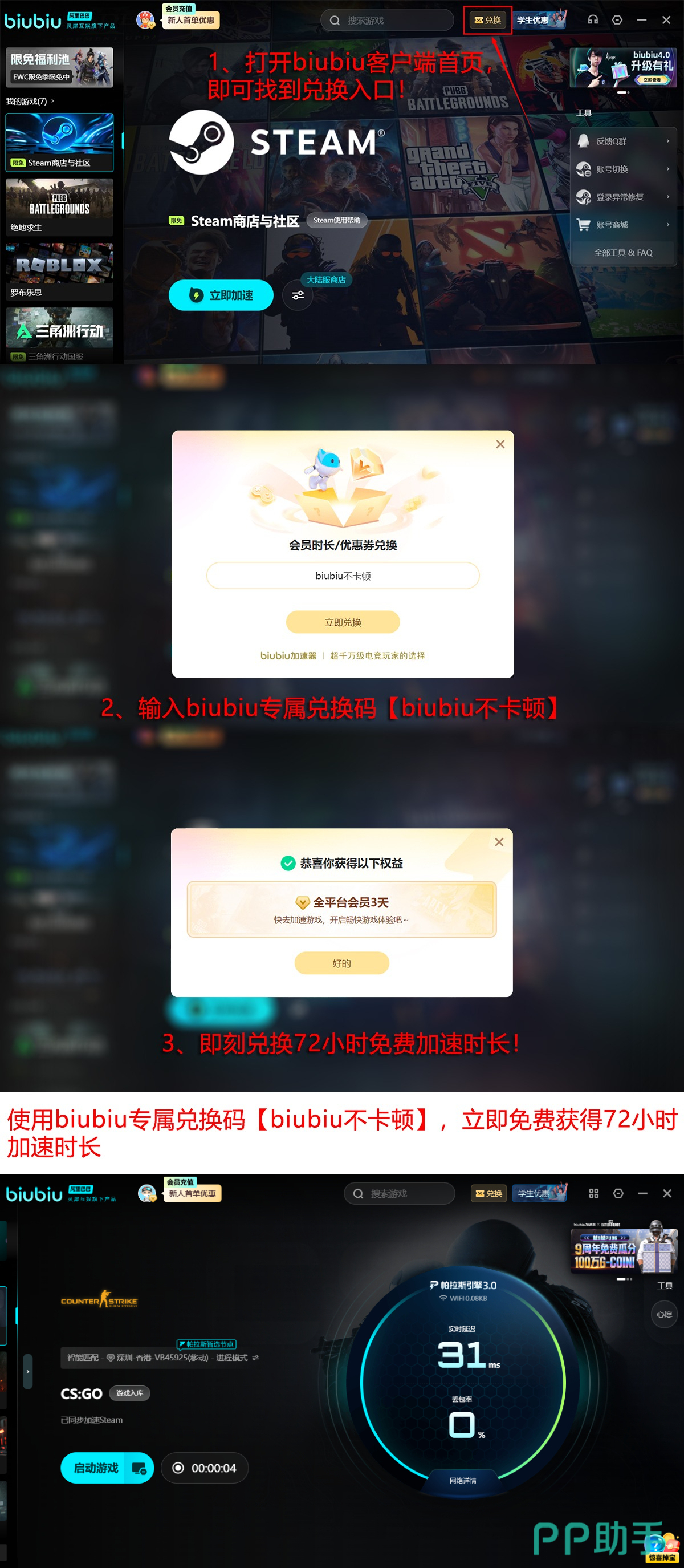 当前新用户注册即可获赠1日免费加速时长;叠加专属兑换码【biubiu不卡顿】,还可额外激活3天连续使用权,总计享4×24小时无限制加速服务,新老用户均可参与一次。