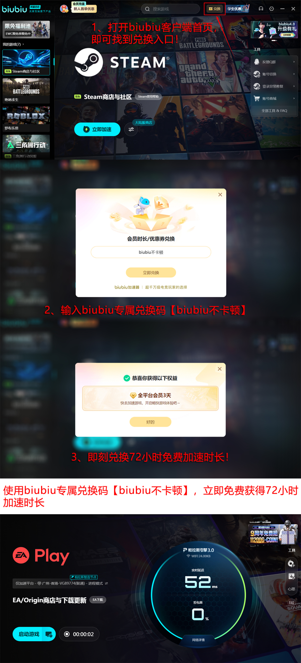 biubiu采用会员制服务模式,但为降低用户试用门槛,现开放两项限时权益:所有账号均可一次性输入兑换码【biubiu不卡顿】,获赠72小时全功能加速时长;新注册用户额外享有24小时免登录即用的新人加速福利,建议先激活新人权益再使用兑换码,总计可连续使用96小时。学生认证用户还可叠加专属折扣,参与平台周期性活动亦有机会领取现金抵扣券,单位时长成本优于同类竞品。