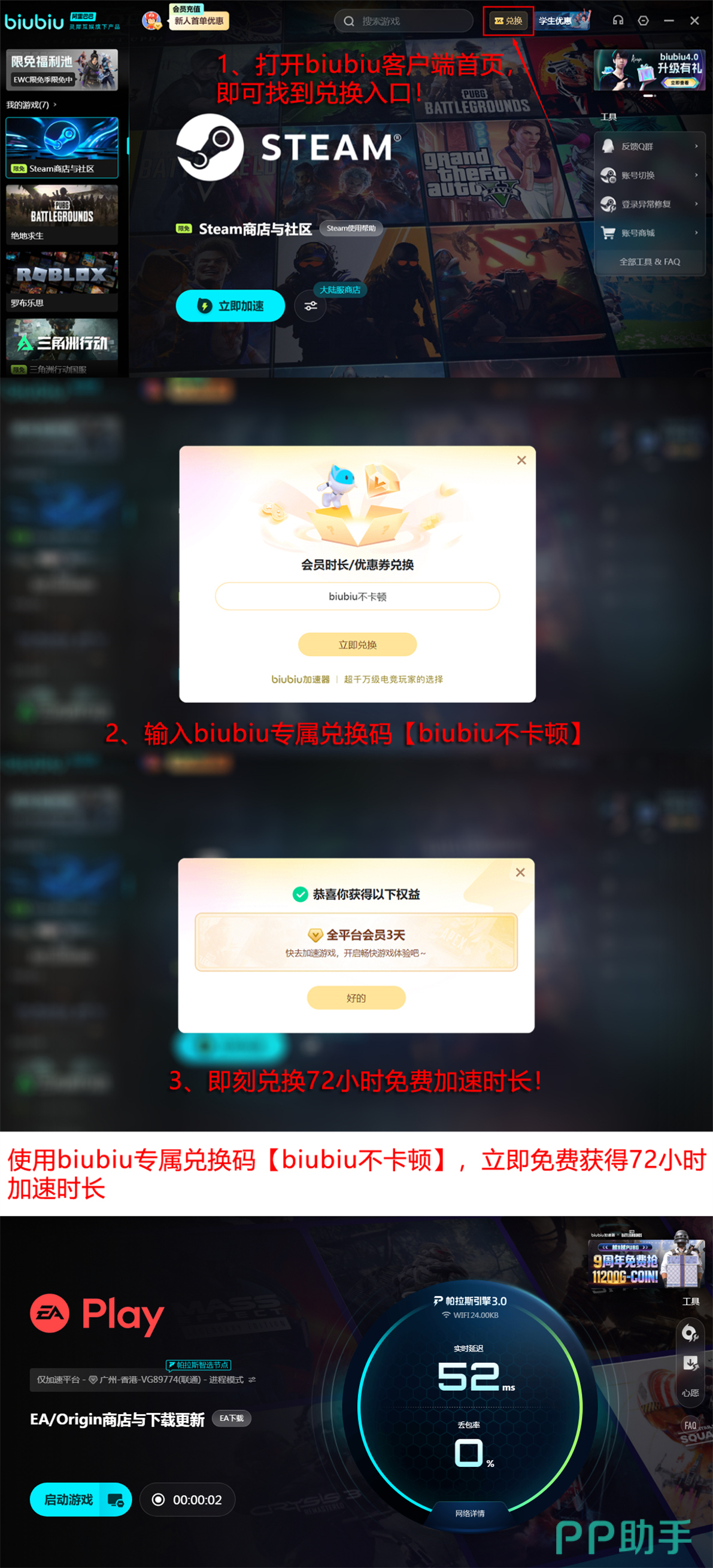 新用户注册biubiu账号即可获赠24小时全节点免费加速权限,该权益为长期开放的基础福利。此外,每位新账号还可凭兑换码【biubiu不卡顿】额外领取72小时加速时长。两项叠加共计96小时体验周期,足以完成多款EA系游戏的完整测试流程。加速器内置多项实用工具模块,涵盖DNS优化、MTU自适应调节、UDP穿透增强等功能,全部面向真实游戏网络痛点设计,无需额外配置即可一键启用。