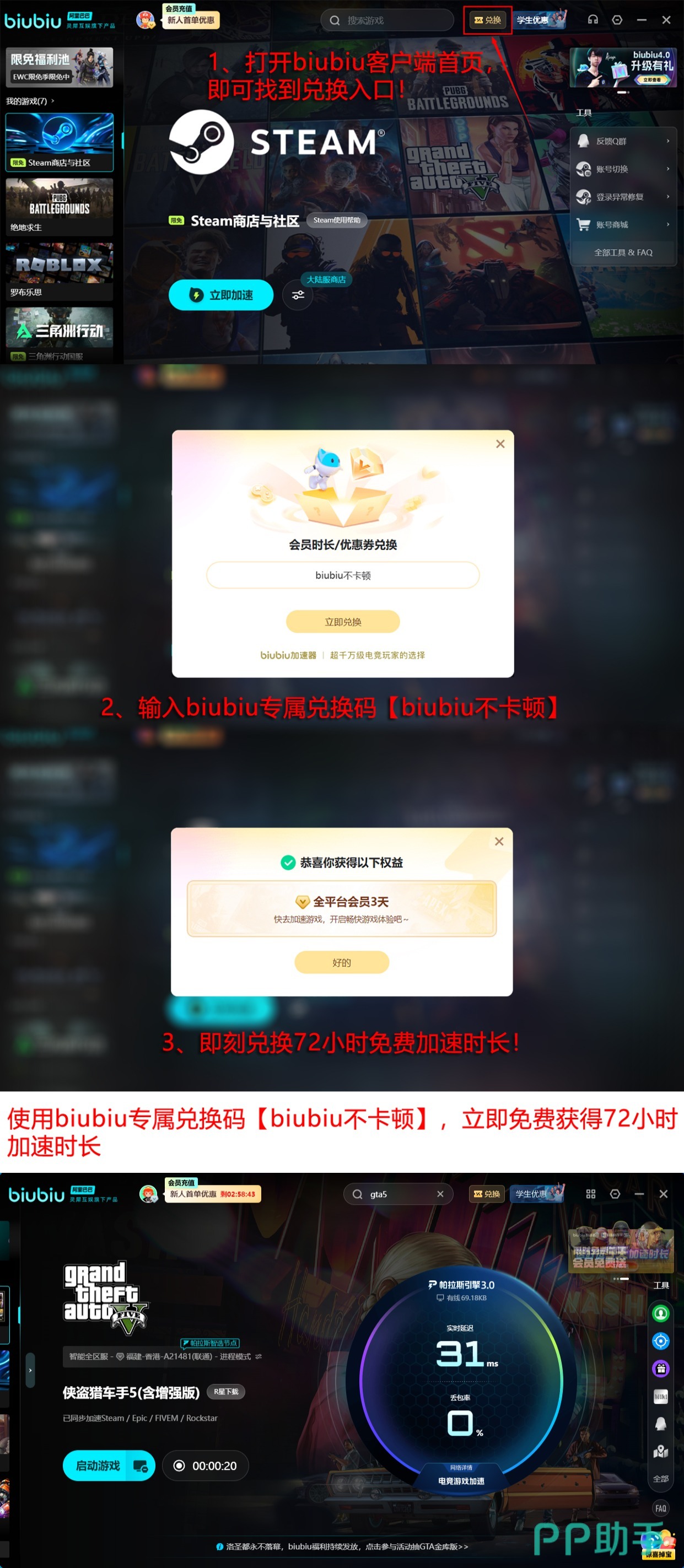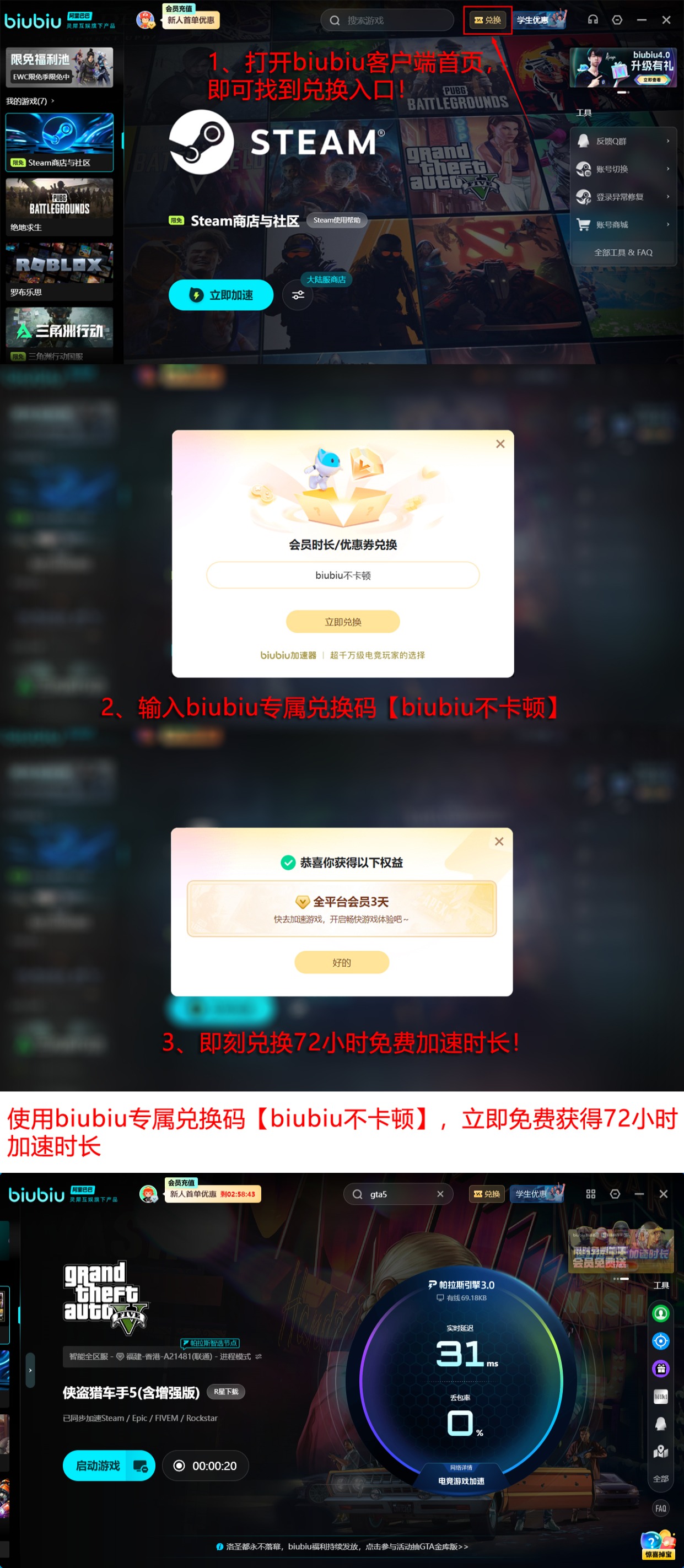 目前biubiu加速器面向新用户提供双重福利机制:注册即赠24小时全游戏通用加速时长;所有用户(含存量账户)在客户端内“兑换中心”输入激活码“biubiu不卡顿”,可额外领取72小时专属加速权益。综合计算,新用户首月可享总计96小时无限制加速服务,老用户亦可获得72小时延展支持,充分覆盖日常联机需求周期。