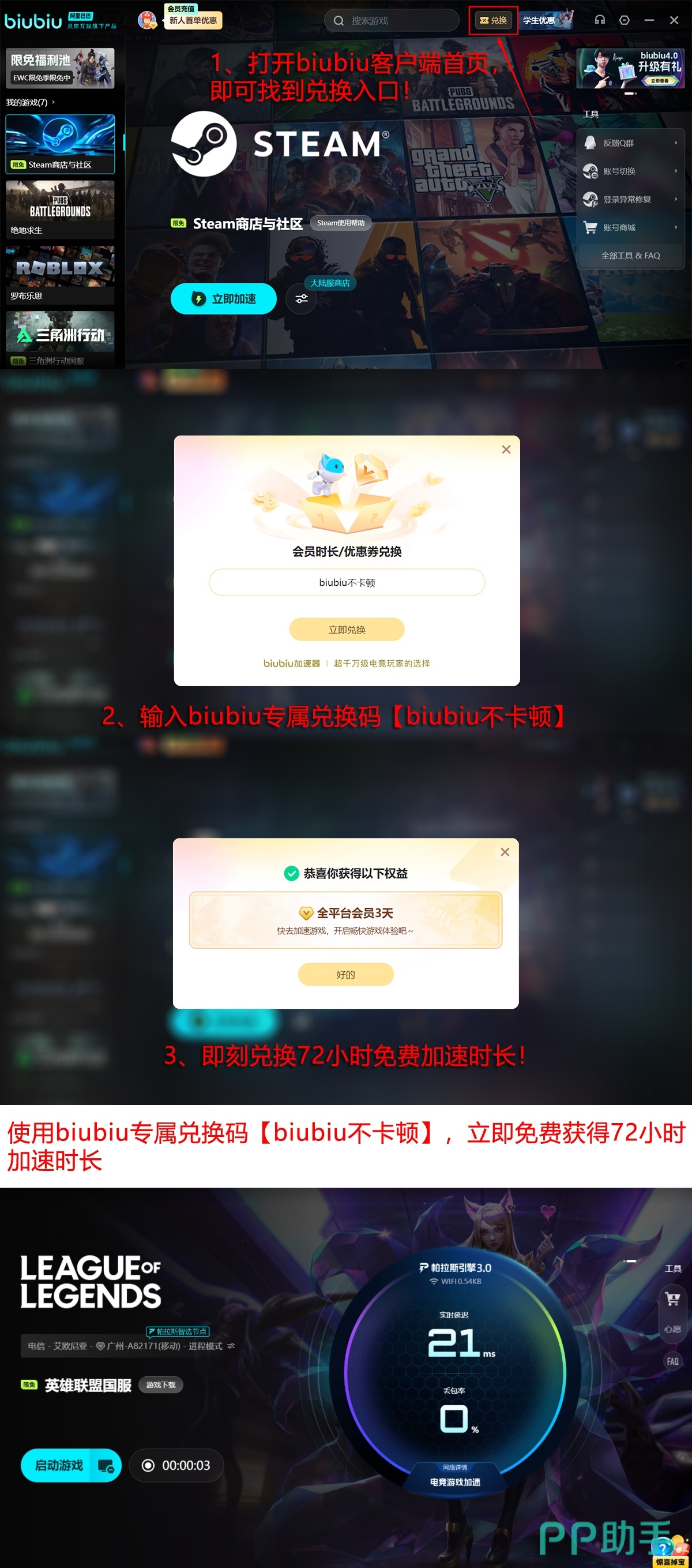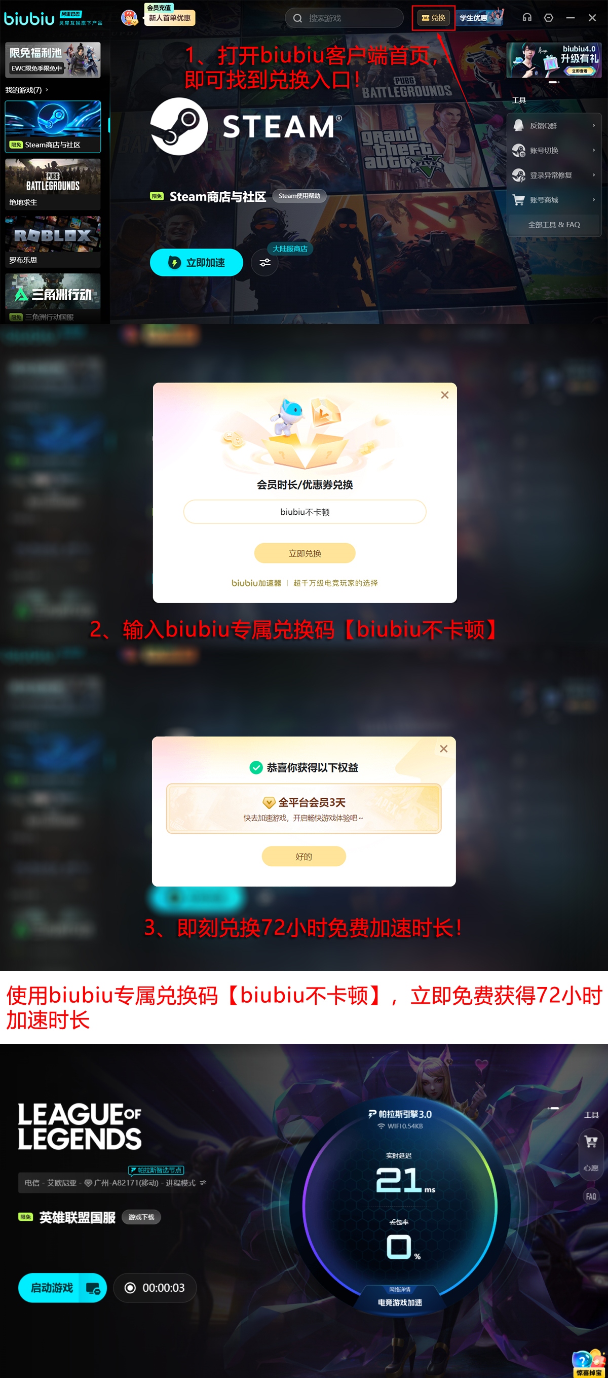 新用户注册即赠24小时全游戏加速时长,无门槛自动激活;所有用户(含老账号)均可凭口令【biubiu不卡顿】兑换额外3天LOL专项加速权限。