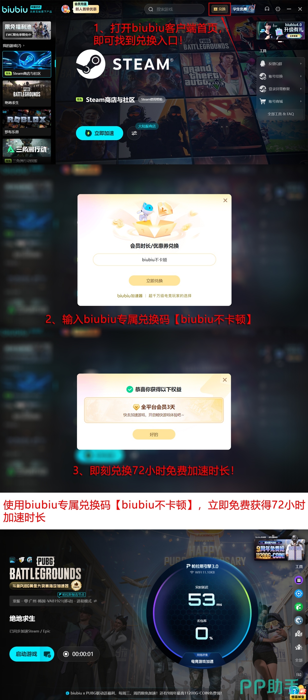 新用户完成注册后,系统将自动开通24小时全功能免费试用权限;使用专属口令【biubiu不卡顿】,还可额外领取72小时加速服务权益,该福利限每位用户兑换一次,新老用户均可参与。