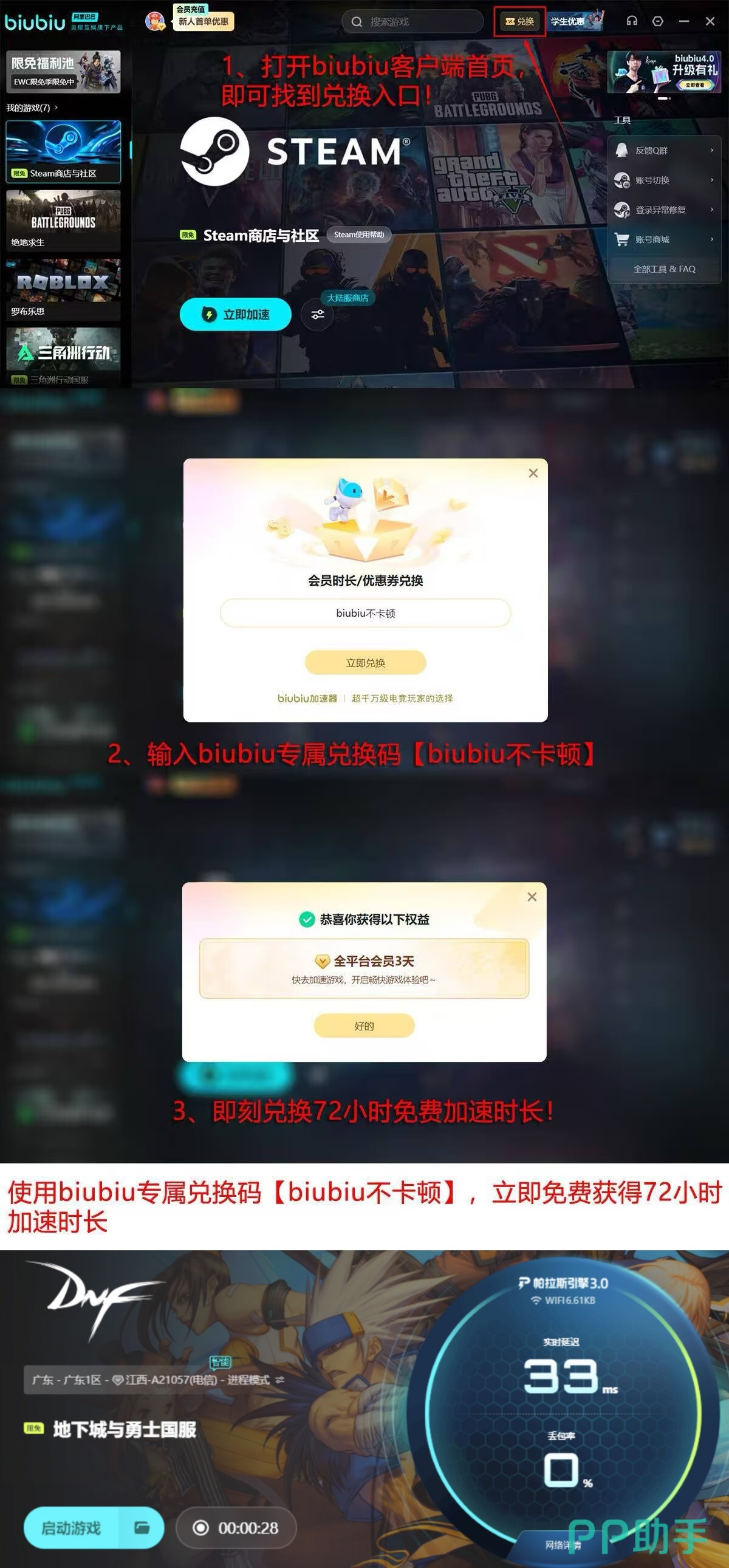 每一次闪退都可能打断关键副本流程、影响副本评分甚至导致角色异常掉线。为满足DNF玩家对连接零中断的严苛需求,biubiu持续迭代底层协议调度逻辑与抗抖动机制。对普通用户而言,无需复杂设置即可启用——新用户注册后即可获得24小时全功能免费加速权限;输入口令【biubiu不卡顿】(请严格使用小写字母),还可额外获赠3天高级会员服务,该口令面向所有用户开放,不限新老账号,。