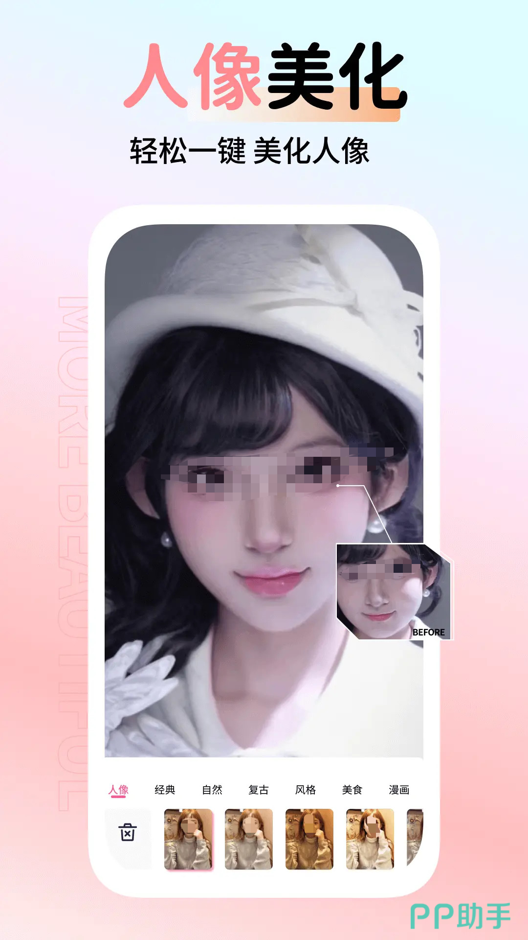 该软件的人像功能支持五官的重塑和妆容的添加,效果非常的自然。还覆盖了不同类型的滤镜的风格选择,并且支持自定义调节滤镜强度以及贴纸和文字拼图的功能。