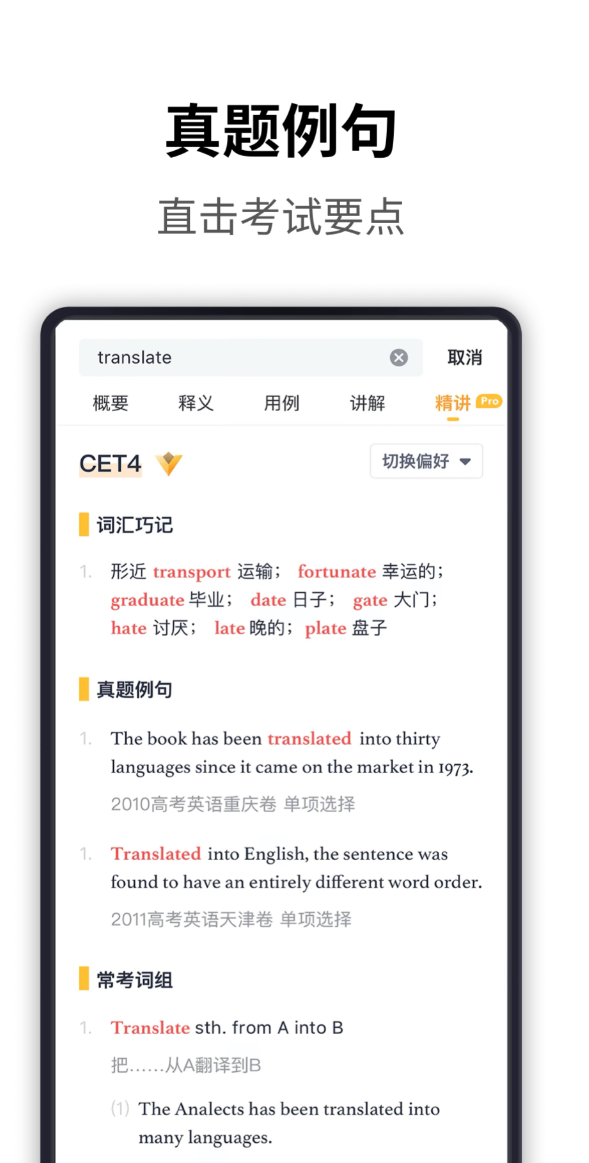 创立于2003年,专注词典领域超过二十年,用户积累已达千万量级。《英汉大词典》主编陆谷孙教授曾为其题词,词典领域的专业背书不算少。词汇精讲板块对常考词组、词义辨析、词源解说都有覆盖,不只是给出释义,还帮助理解词汇背后的用法逻辑。考频统计通过数据抓取词汇在历年考试中的出现频率,备考时能更有针对性地分配复习重点。