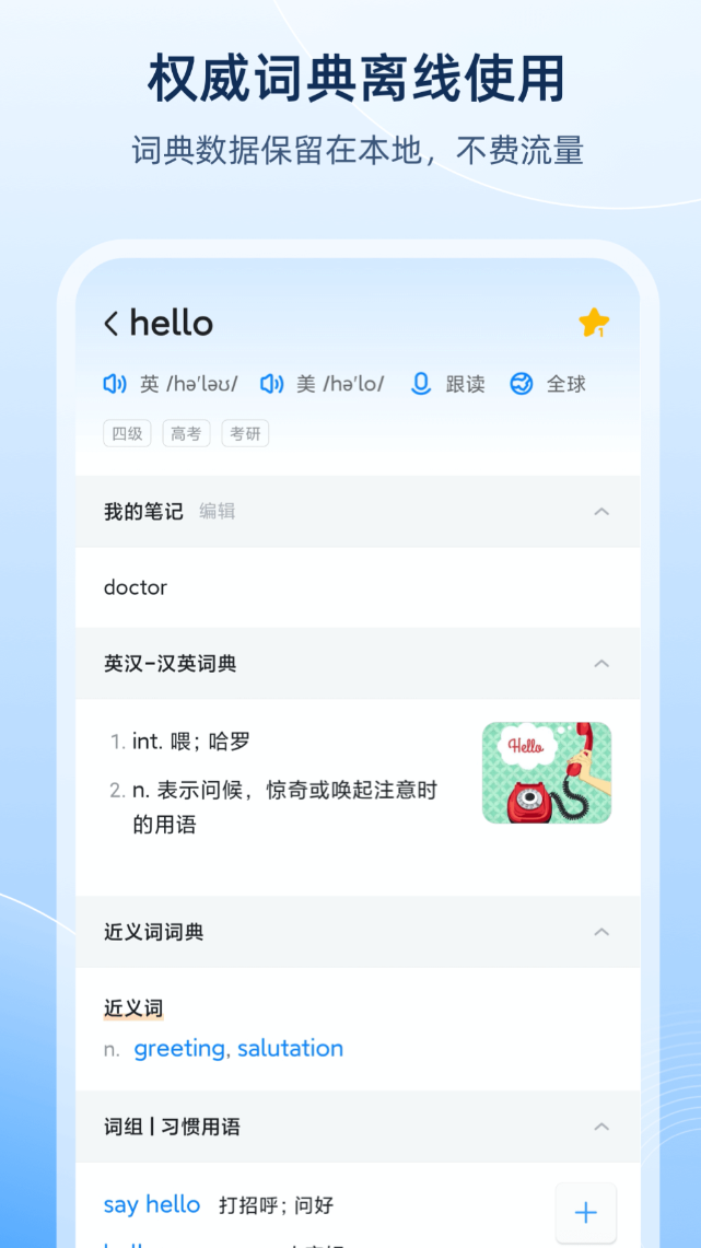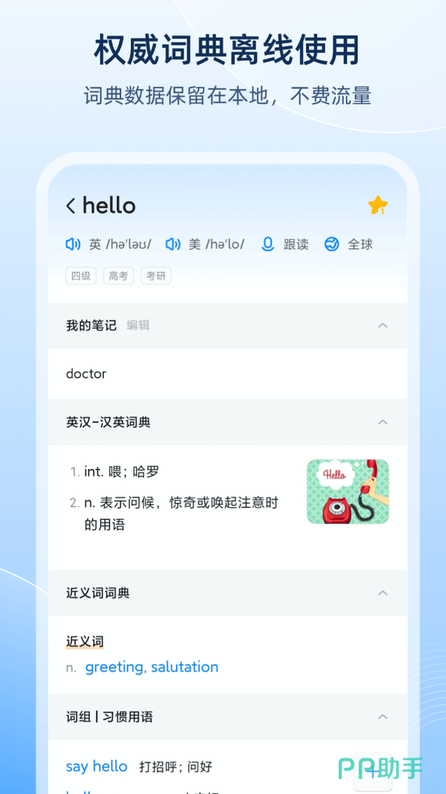 被豌豆荚小编评为"安卓上最好的词典",这个评价放在这里不算夸张。常用英汉词条30万个,专业词条40万个,例句库收录178万条,查生僻词基本不会扑空。拍照取词支持摄像头实时取词,阅读文献时遇到不认识的单词,对着拍一下就能查。跨软件取词功能在用其他应用时也能调出释义,不用来回切换。