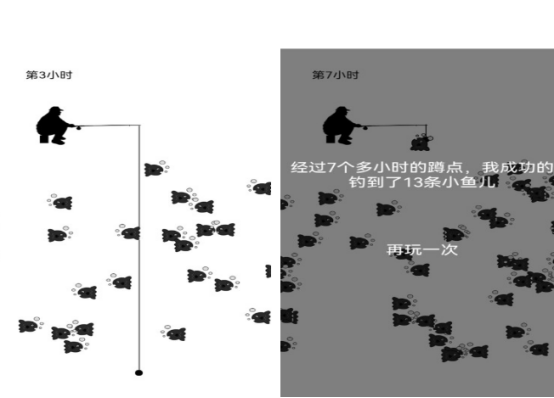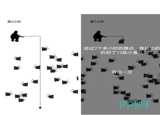 本作采用极简美术风格,主打低门槛、高沉浸的垂钓体验。玩家以“钓鱼者”身份驻守钓点,系统实时显示蹲守时长——等待时间越久,水面浮现的鱼群越密集。操作仅需在鱼群聚集瞬间点击即可收竿,成功后自动计入渔获数量。全程无内购压力,所有功能开放,真实还原静心守候、一击即中的垂钓乐趣。
