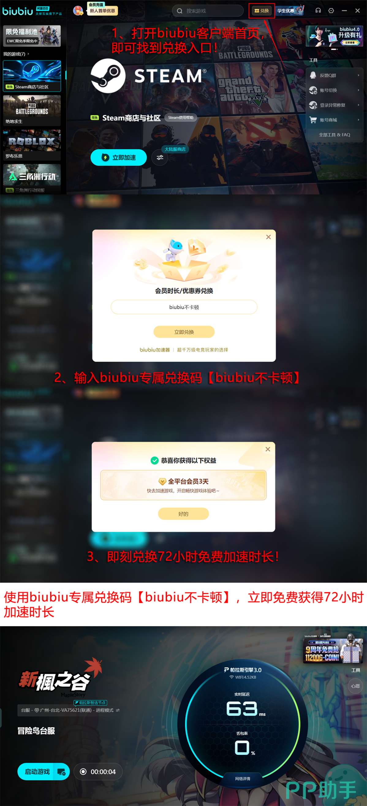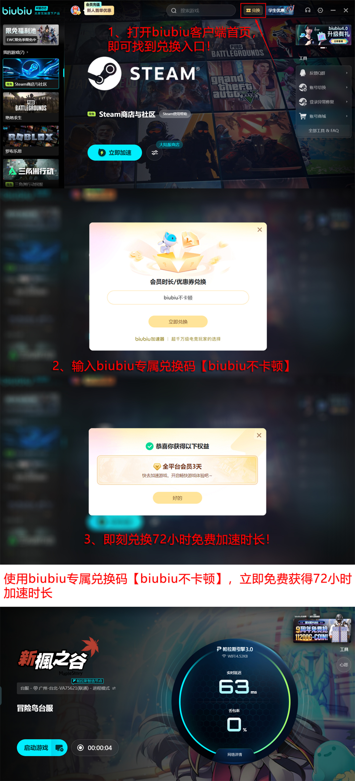 新用户注册后即可领取新人专属24小时免费加速时长,即开即用,零门槛体验优化效果。此外,输入兑换码【biubiu不卡顿】还可额外获得72小时加速权益,每位账号限兑一次。两项叠加后,新用户总计享有96小时全游戏通用加速服务,覆盖《冒险岛》及其他多款联机类游戏的网络优化需求。