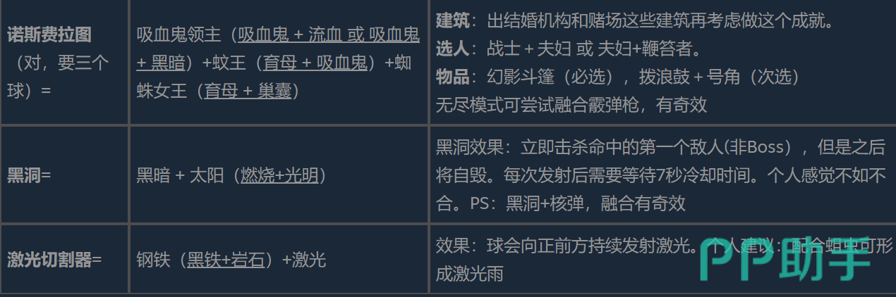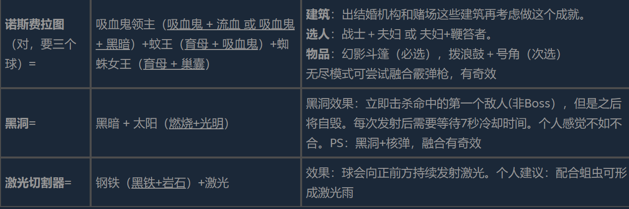 对只求极限单体爆发或者特殊机制的玩家来说,可以用撒旦和诺斯费拉图进行进阶合成。撒旦是由梦魇(魅惑+黑暗)和魅魔(魅惑+吸血鬼)结合而成的,虽然没有具体的文字描写,但是它的组合常常会暗示出强大的控制力和吸血的能力。而更复杂的一个“诺斯费拉图”就是三球融合,即吸血鬼领主、蚊王和蜘蛛女王。该合成对建筑和选人有很高的要求,建议先解锁婚介中心、赌场,并且搭配上战士+夫妇或者夫妇+鞭笞者的阵容,携带幻影斗篷等重要遗物。