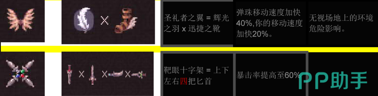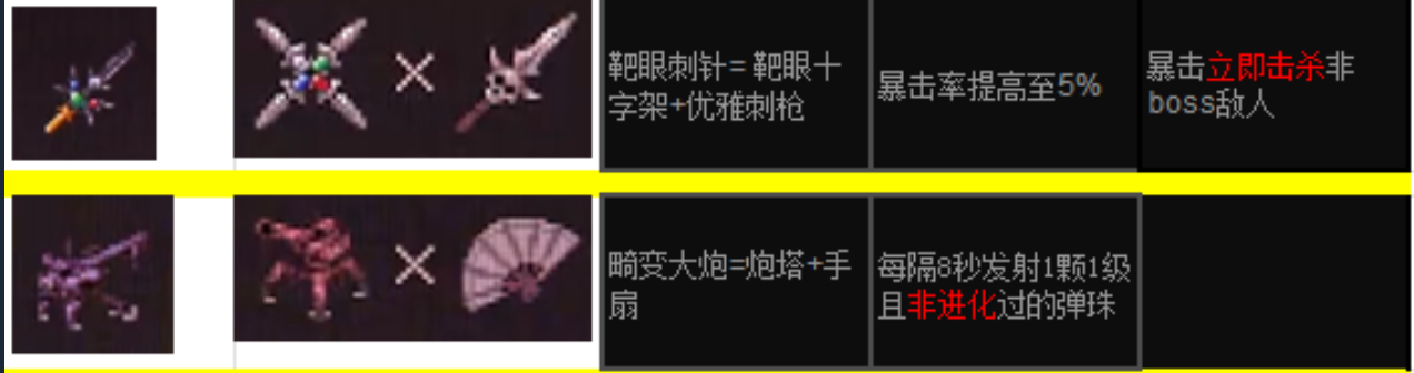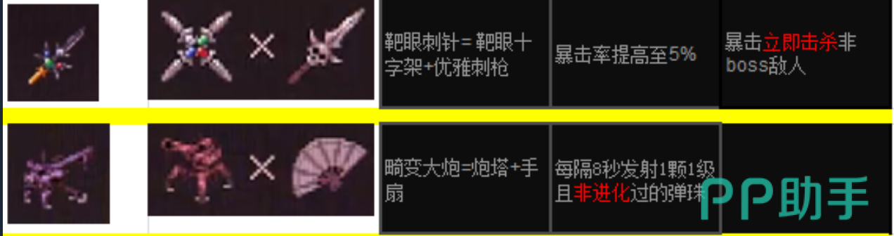 更有一些非常特殊的合成公式,比如“处刑者面具”、“圣礼者之翼”和需要四把匕首合成的“靶眼十字架”,分别给敌人赋予了概率即死、速度大幅度提高、无视环境危险等逆天属性。尤其是“靶眼刺针”和“畸变大炮”这样的高阶合成,用叠加前置组件的方式使暴击率质变、自动召唤攻击弹珠的效果得以实现。